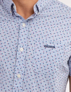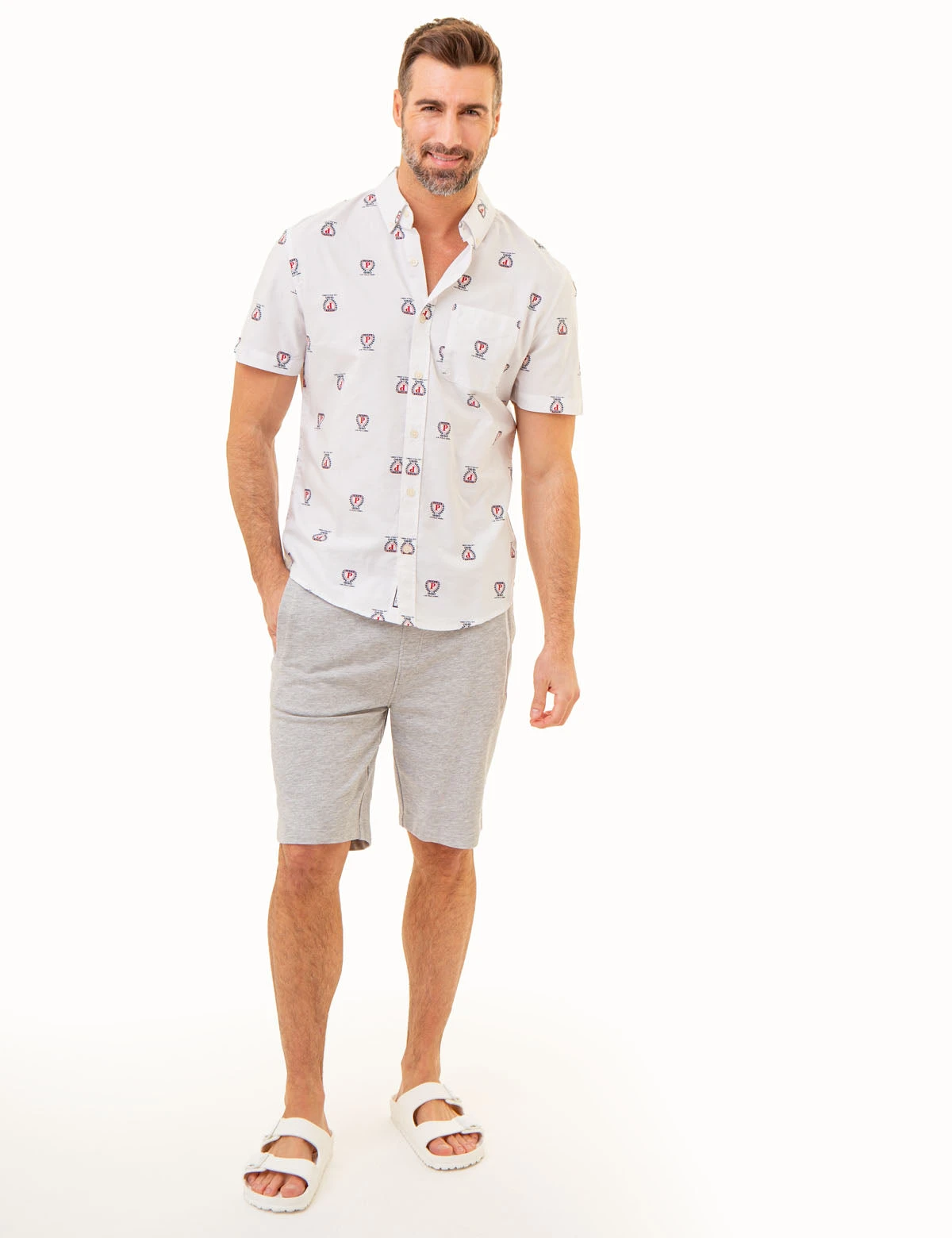 Elevate your ensemble with this lavish ALL OVER CREST PRINT OXFORD SHORT SLEEVE SHIRT. Showcasing a smart collared neckline and short sleeves, framed by a graceful, curved hemline, it is adorned with a sophisticated allover Crest print for a look of exclusive distinction. Model is wearing a size Medium.