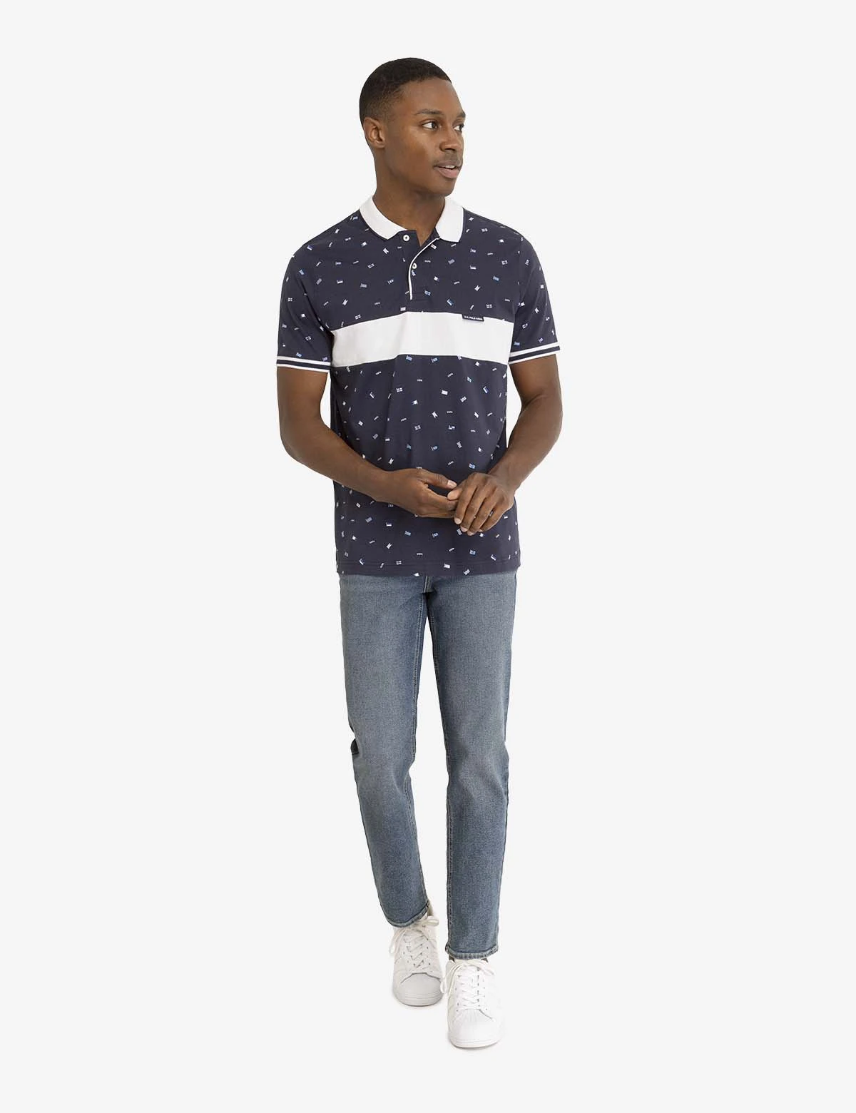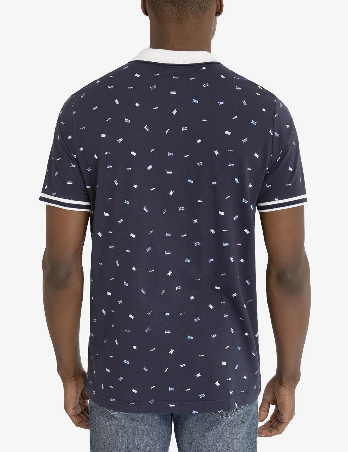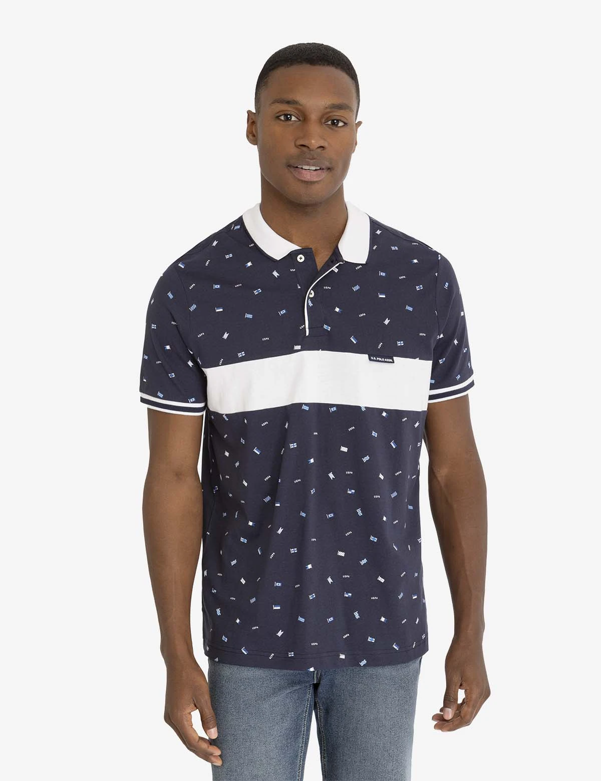 Our ALL OVER FLAG PRINTED JERSEY POLO SHIRT exudes a captivating look. This remarkable piece flaunts a contrast tipped collar, a two-button placket, short sleeves trimmed with ribbing, and a stunning allover flag print. Furthermore, this polished style boasts a horizontal panel across the front chest and a refined U.S. POLO ASSN. label stitched to the upper right. Model is wearing a size medum.