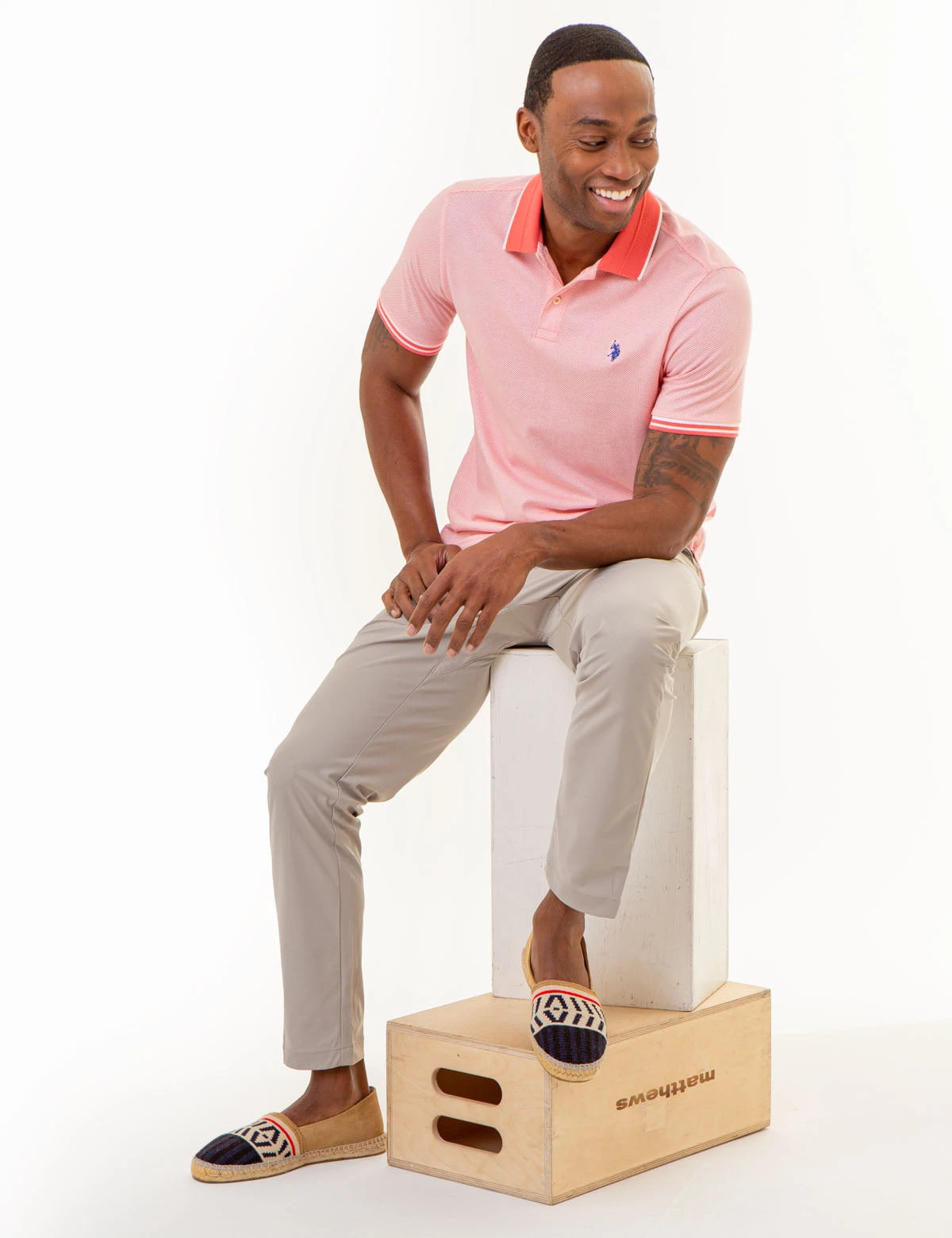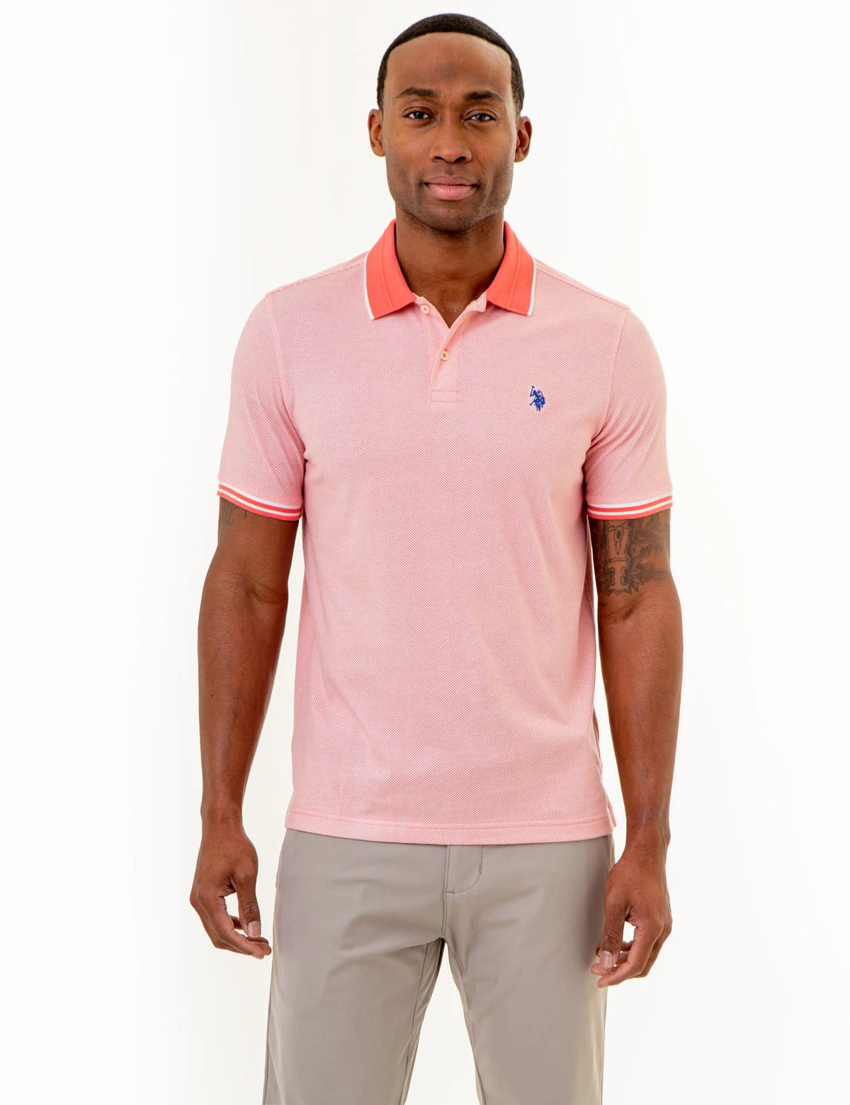 Our ALL OVER PRINT TEXTURED COLLAR POLO SHIRT comprises a refined union of sophistication and style. Boasting a timeless tipped collar with a two-button placket, this stellar design is further enlivened by stylish striped ribbed cuffs and a dainty contrast embroidered logo at the upper left front. Vents at the hem complete this timeless piece. Model is wearing a size medium.
