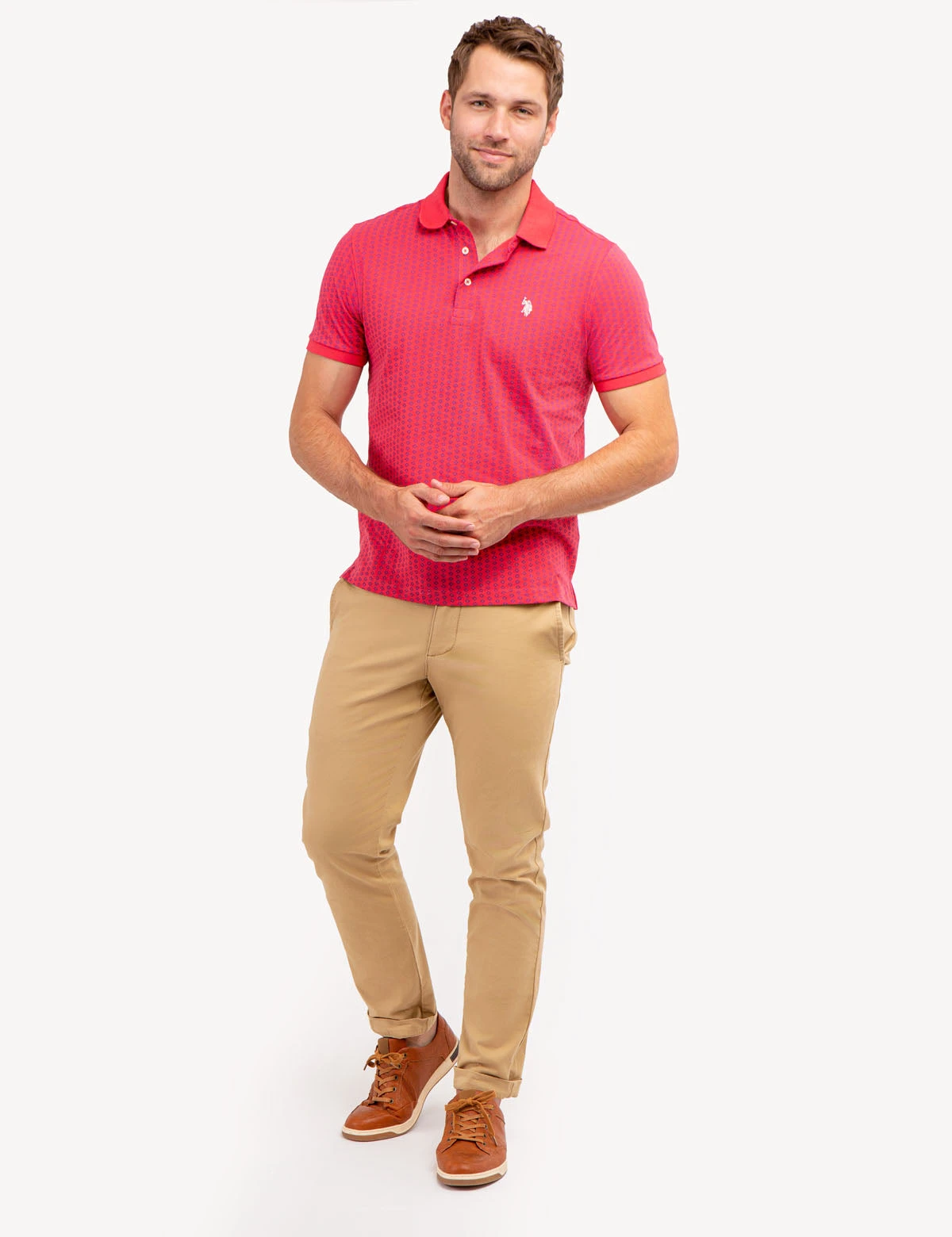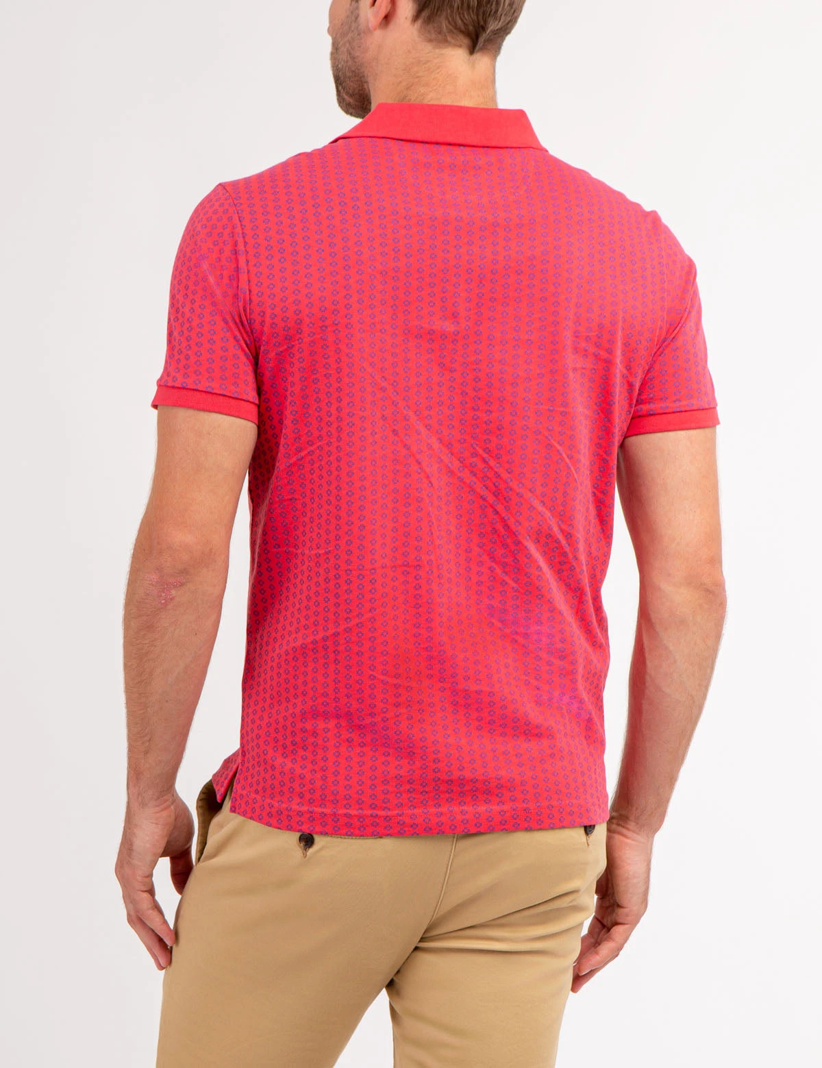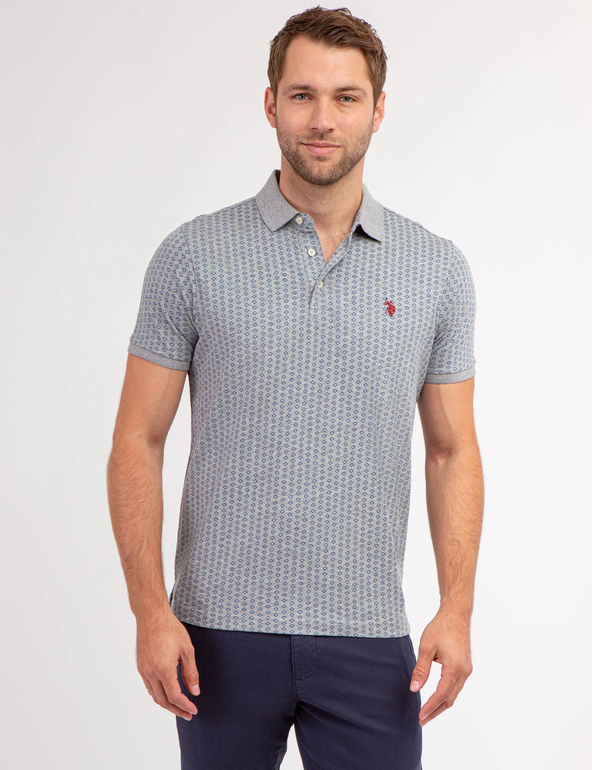 Our ALLOVER PRINTED JERSEY POLO SHIRT is crafted to exude sophistication and luxury, showcasing a classic collar with a three-button placket, short ribbed sleeves, an alluring allover print, an embroidered logo on the upper left chest and vents at the hem. Model is wearing a size medium.