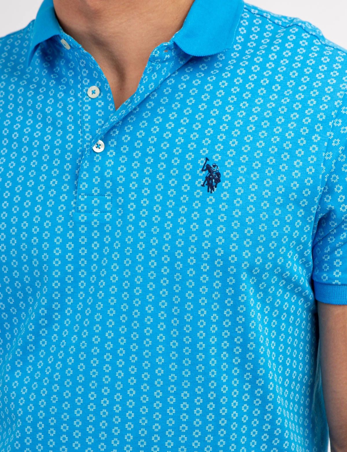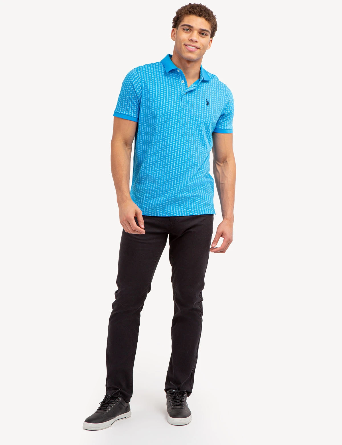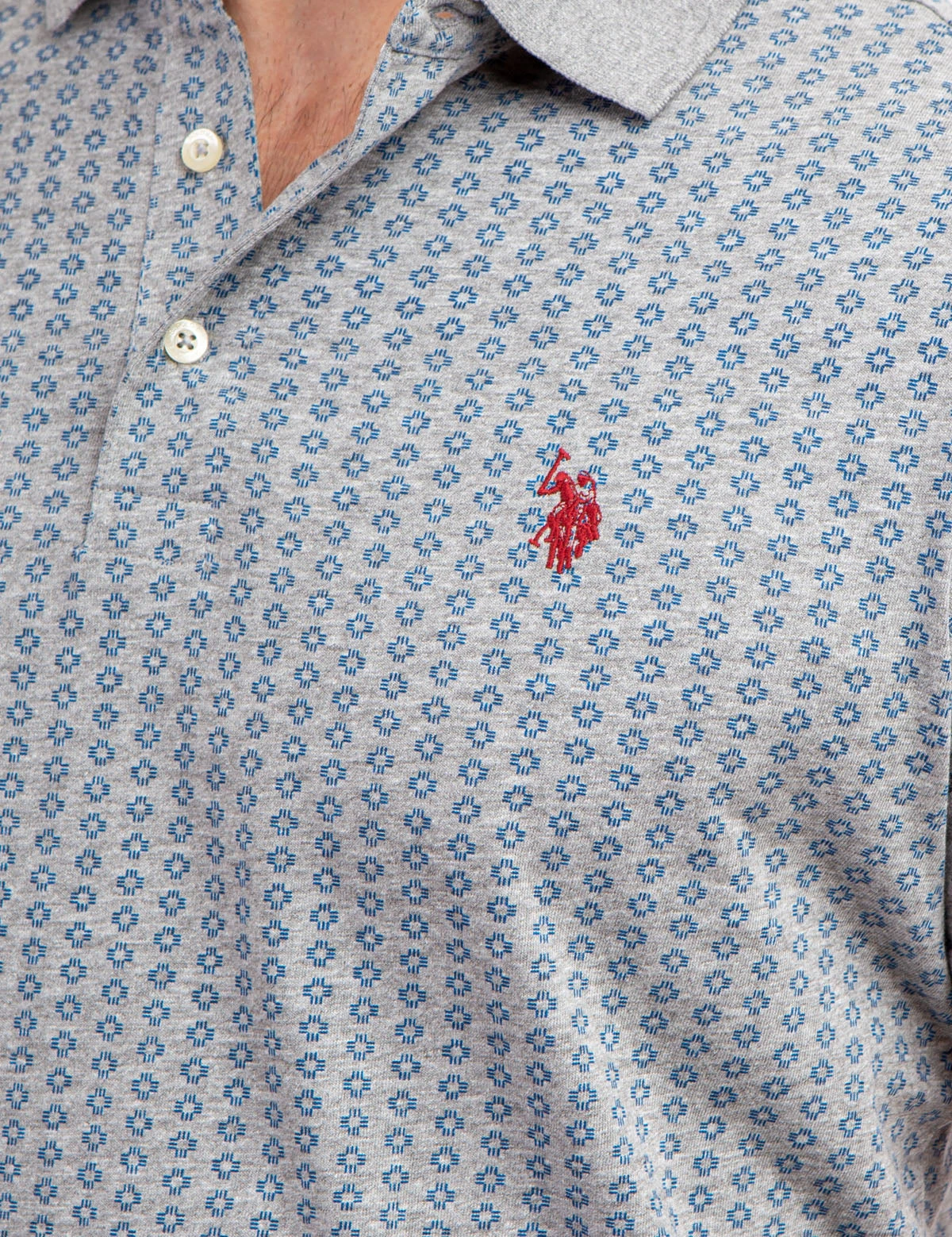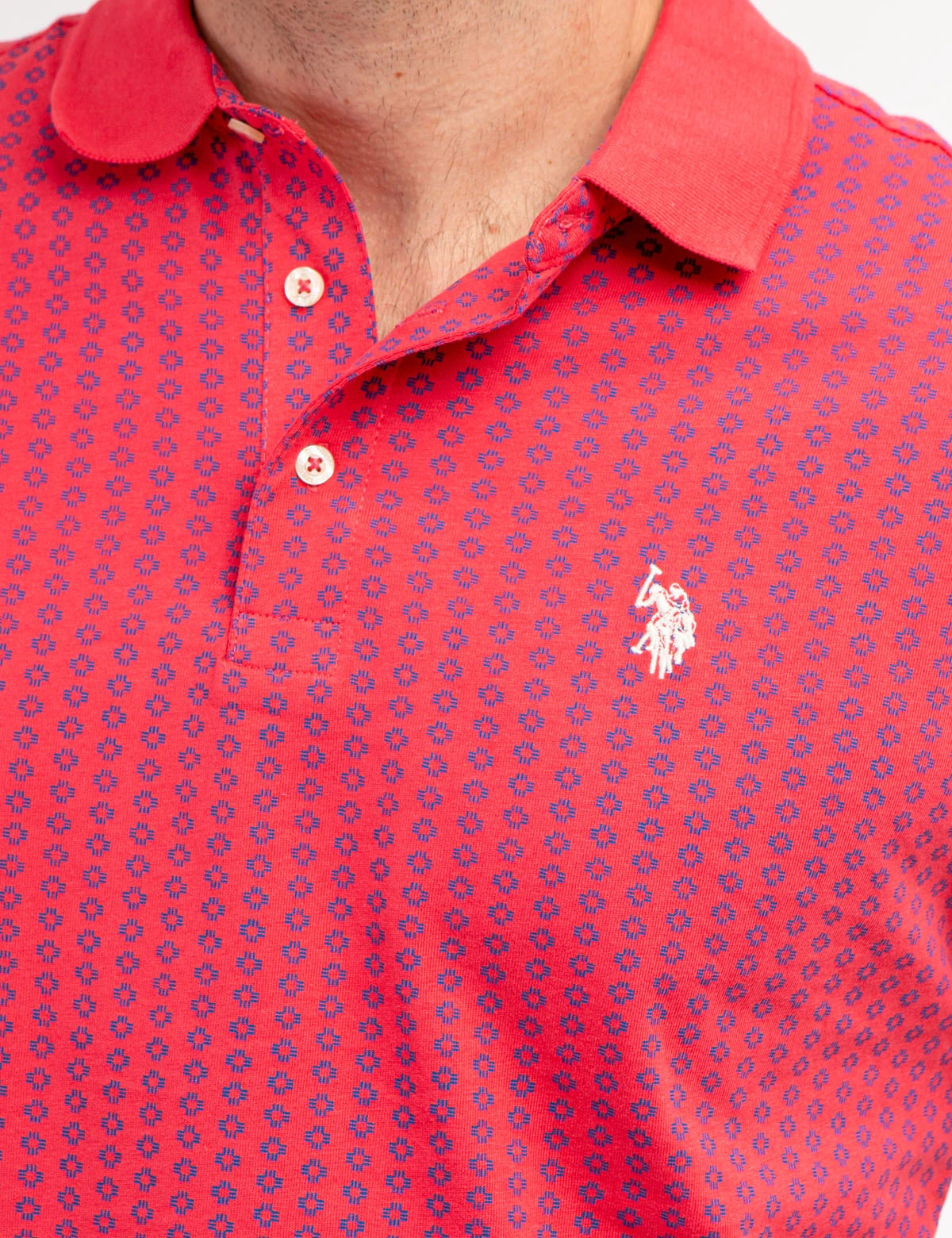 Our ALLOVER PRINTED JERSEY POLO SHIRT is crafted to exude sophistication and luxury, showcasing a classic collar with a three-button placket, short ribbed sleeves, an alluring allover print, an embroidered logo on the upper left chest and vents at the hem. Model is wearing a size medium.