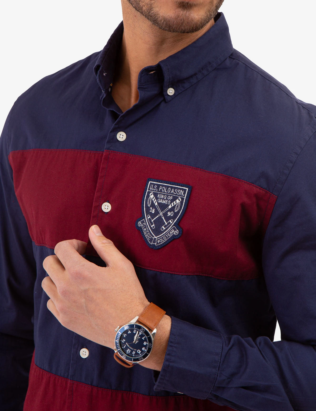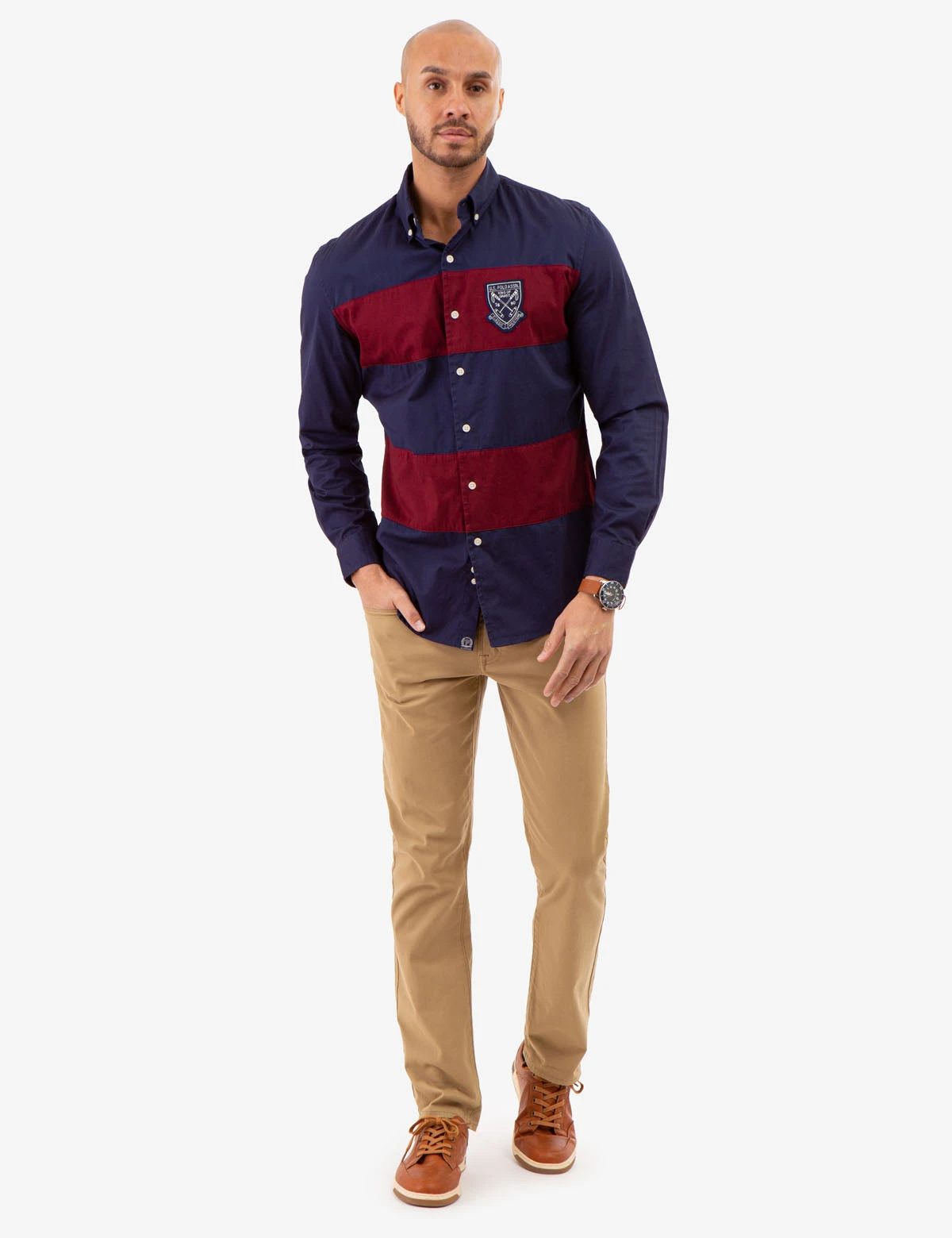 Presenting a luxurious, modern COLORBLOCK PEACHED TWILL LONG SLEEVE SHIRT featuring an eye-catching large patch logo and stylish Colorblock pattern throughout. The regular fit lends a comfortable feel while the front button closure and collared neckline adds a touch of sophistication. A timeless classic for any wardrobe. Model is wearing a size Medium.