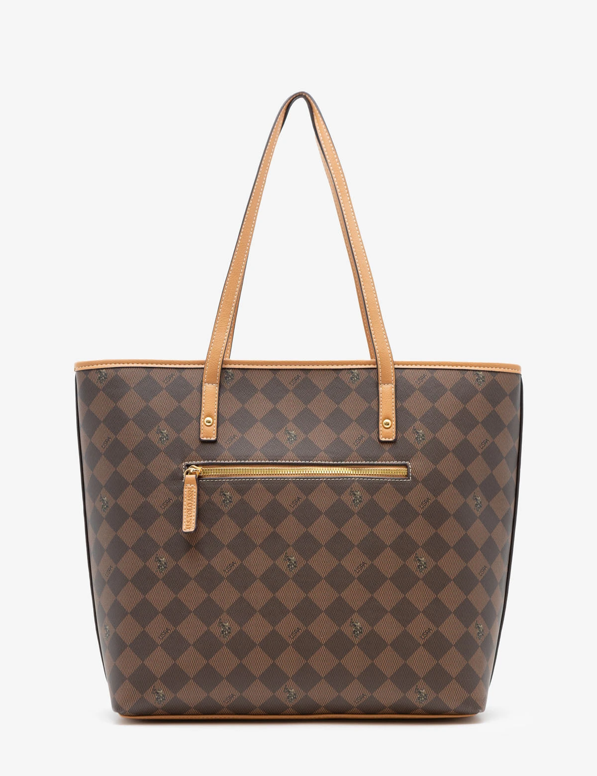 This classic DIAMOND SIGNATURE TOTE BAG features a two-tone diamond pattern with a double horseman and USPA logo print, plus USPA logo hanging hardware. Crafted from 100% PU, it features a top zip closure and measurements of 13.5″ in height and 13″ in width. The perfect addition to any outfit.