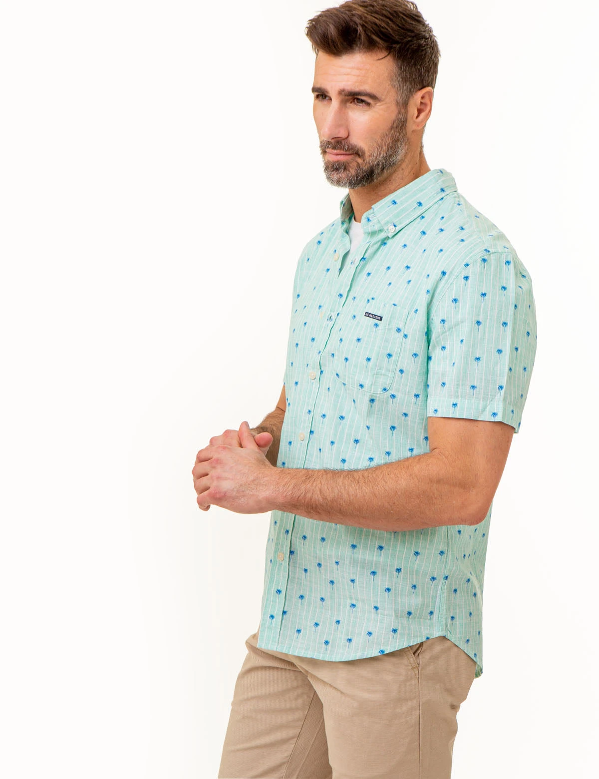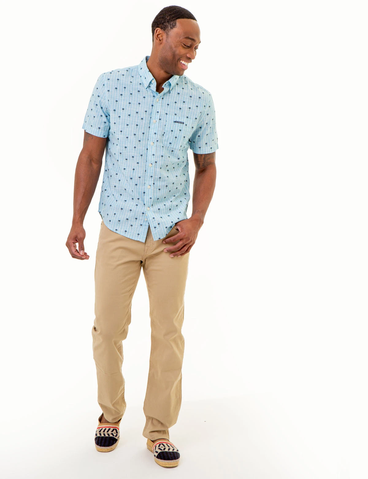 Displaying classic sophistication, this DITSY PALM TREE PRINT WOVEN SHIRT WITH POCKET has a timeless design, featuring a buttoned spread collar, buttoned front closure, and short sleeves. Rendered in a flattering classic fit, this shirt is imbued with an alluring allover Palm Tree Ditsy floral print, plus a branded patch on the left chest pocket. Model is wearing a size Medium.Â