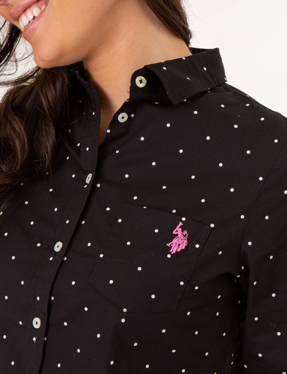 Our DOT PRINT LONG SLEEVE POPLIN SHIRT is an enduring wardrobe staple that effortlessly transitions from casual to dressy. It features a classic spread collar, long sleeves with button cuffs, a shirttail hemline, and a left chest pocket with an elegant embroidered logo that will add just the right touch of sophistication to your look. Model is wearing a size small.