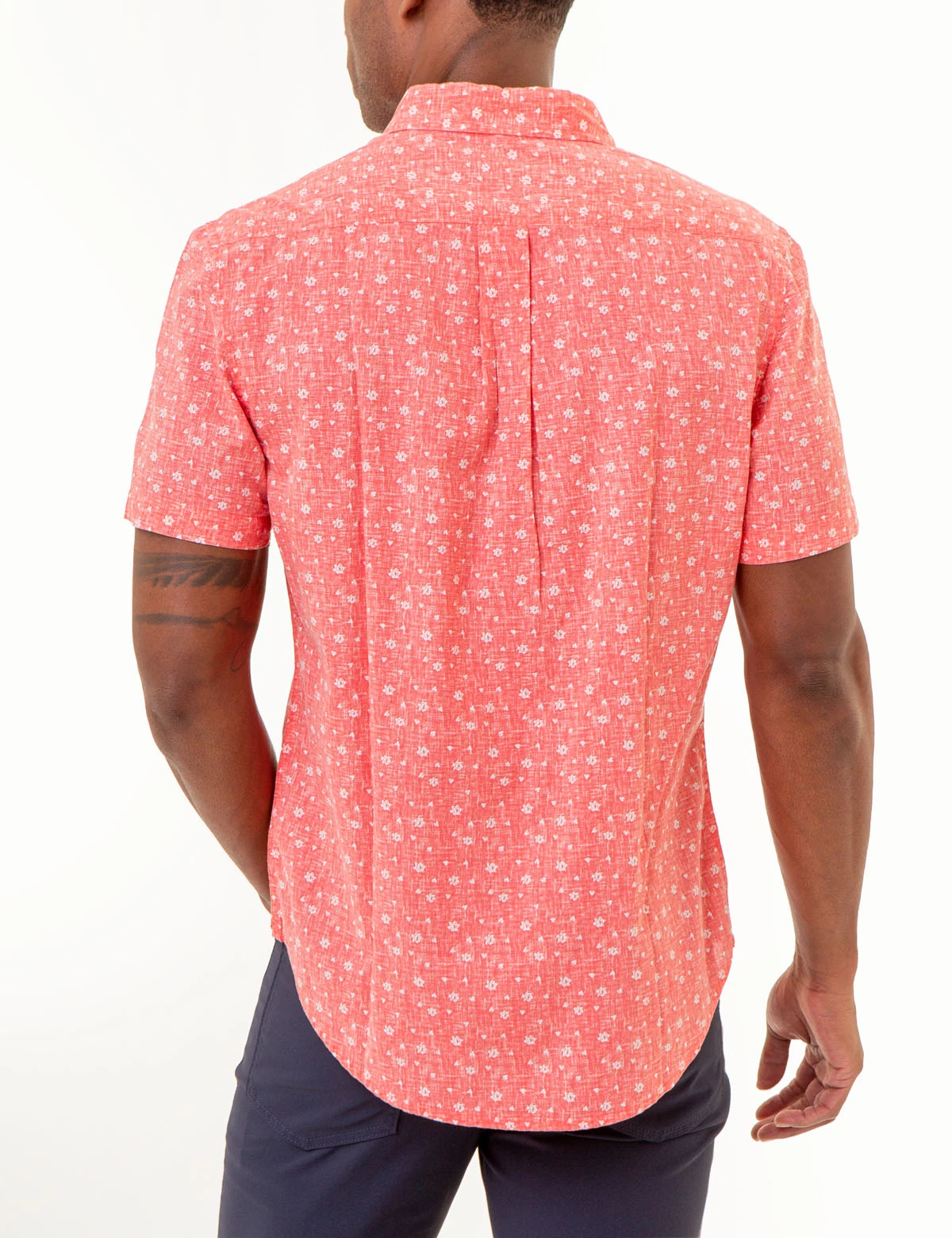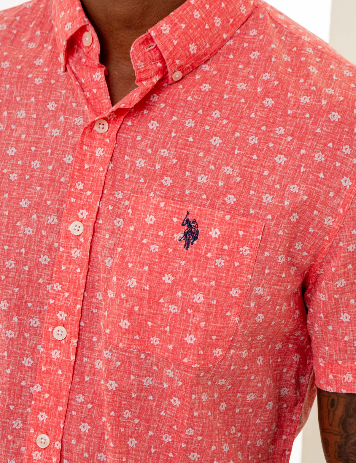 Embellished with an exquisite floral pattern, the FLORAL PRINT SHORT SLEEVE SHIRT WITH POCKETÂ flaunts a stylish button-down collar, short sleeves, a shirttail hem, and a front left chest pocket boasting an embroidered logo. A full button placket ensures lasting comfort and timeless sophistication. Model is wearing a size Medium.Â