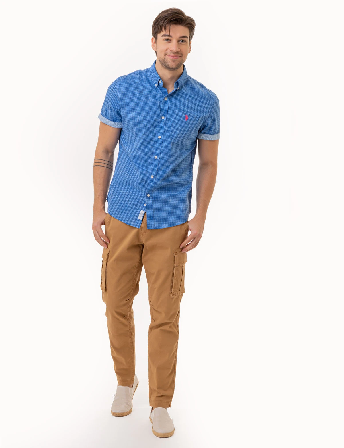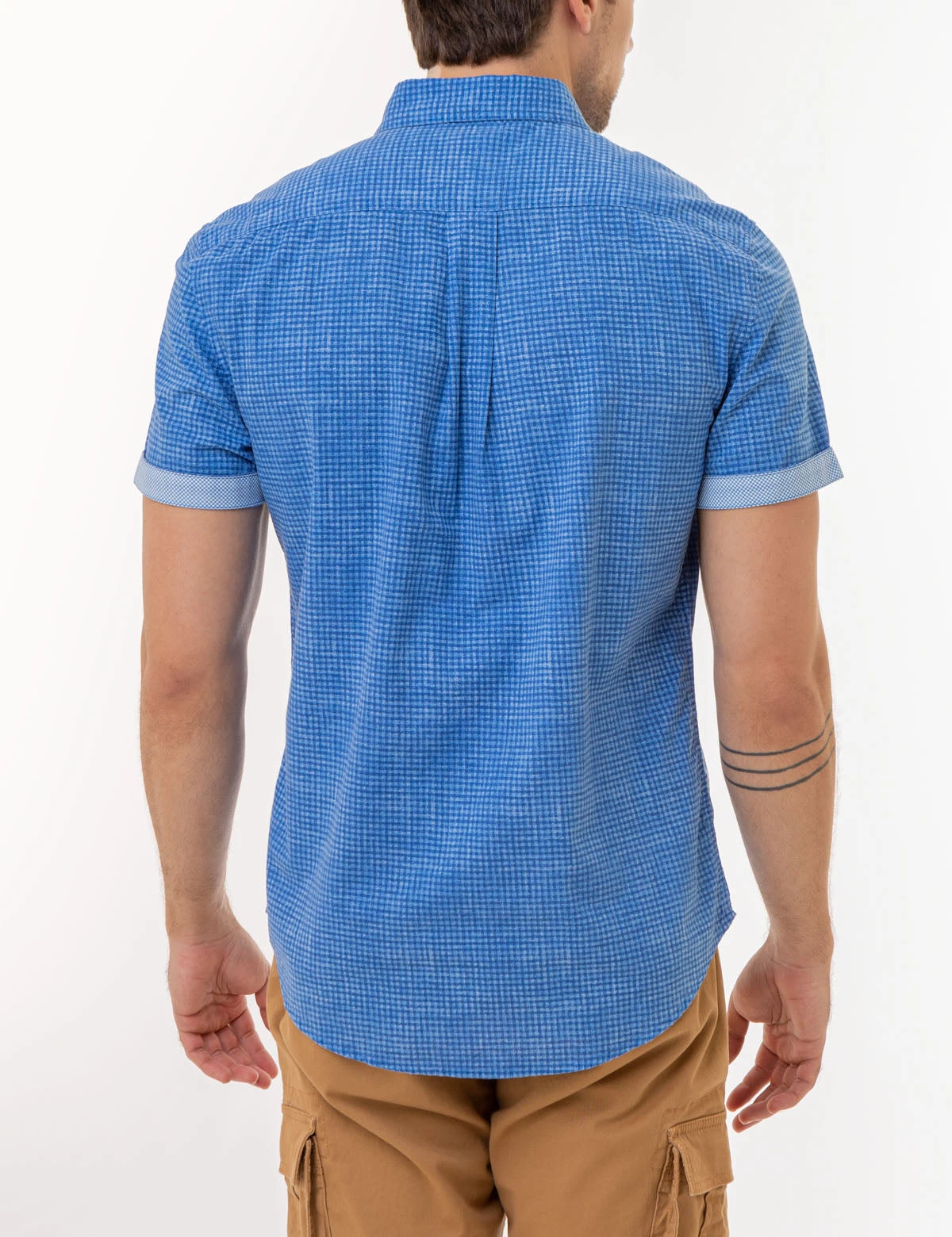 Cut in a luxurious Gingham Slub Poplin fabric, the GINGHAM SHORT SLEEVE SOLID SLUB POPLIN SHIRT shirt features a collared neckline, short sleeves, and a shirttail hemline; a buttoned closure secures the look, while an embroidered signature logo decorates the pocket on the left chest. Model is wearing a size Medium.Â