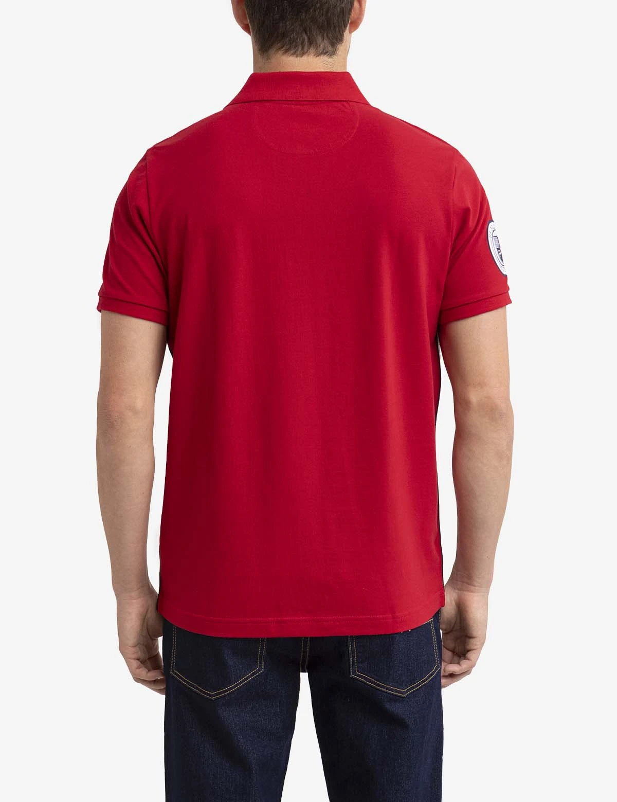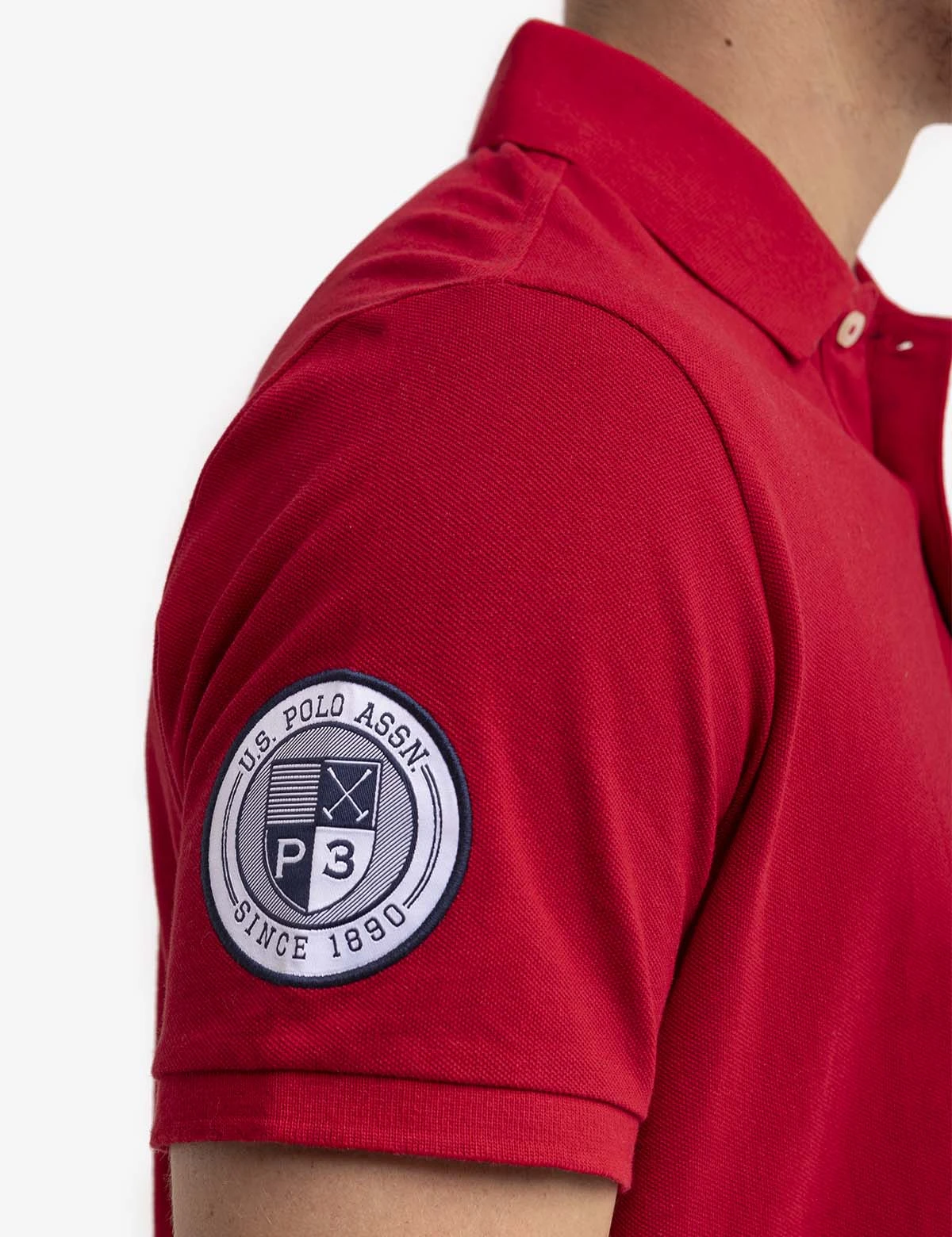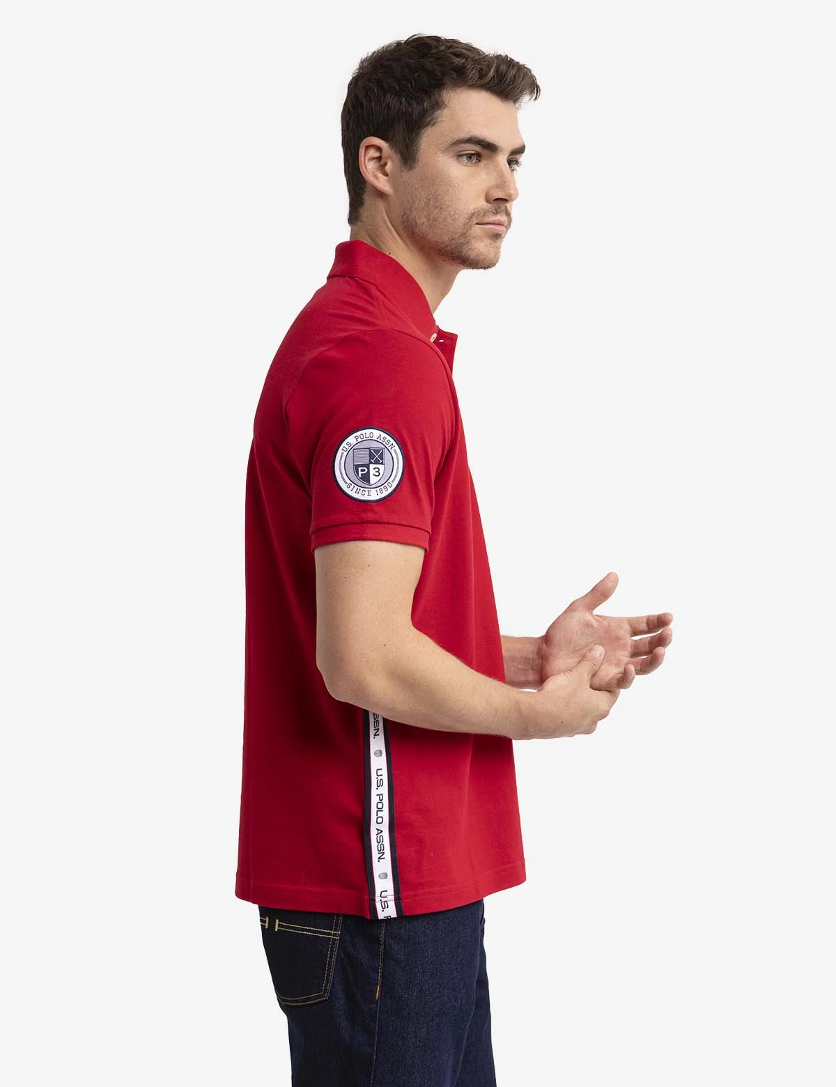 Our GRAPHIC TRIM PIQUE POLO SHIRT offers a traditional outline with stylish, captivating details. This piece includes a classic collar with a vibrant lining, a two-button placket, short sleeves, a large embroidered logo on the front left side, a USPA shield badge on the right arm and USPA branded trim along the sides. Model is wearing a size medium.