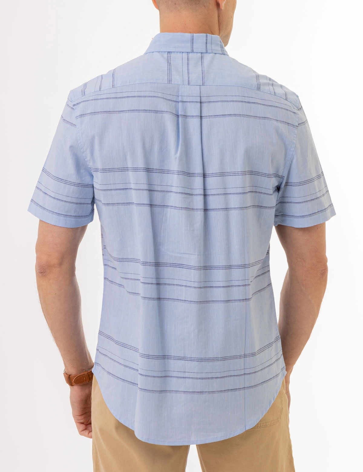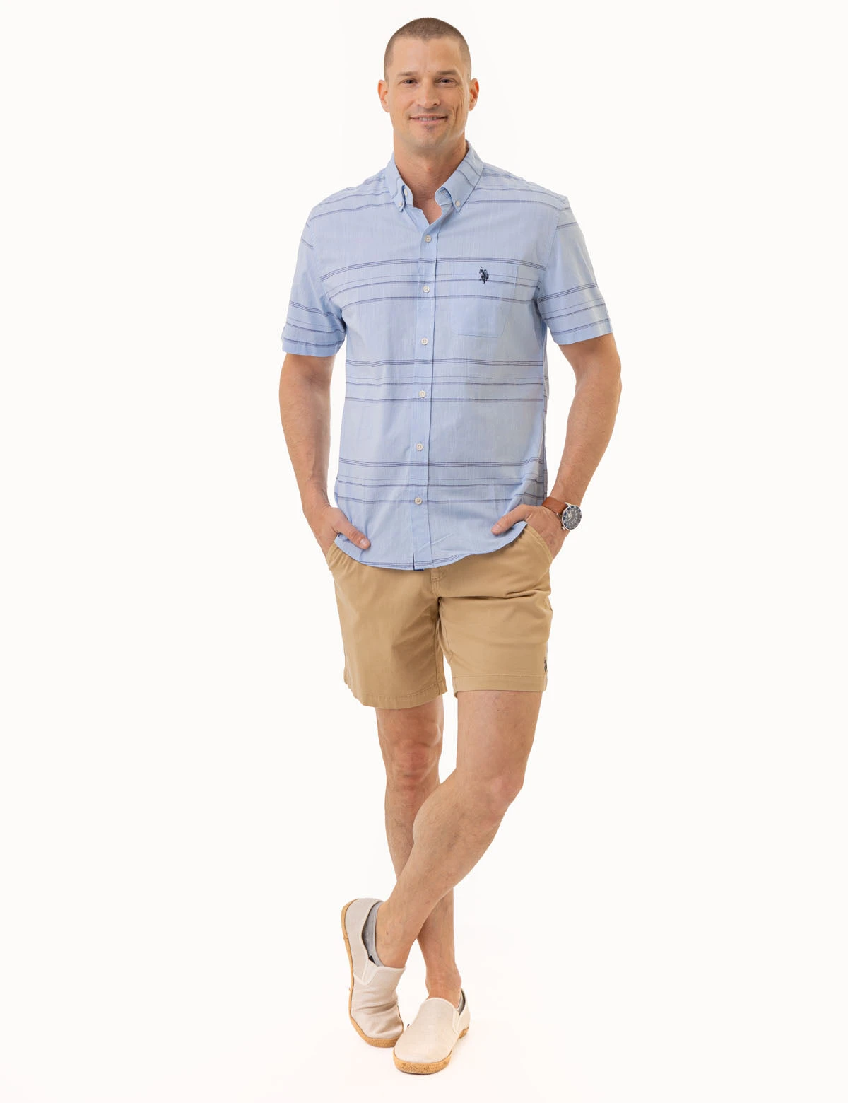 A sophisticated, stylish addition to any wardrobe, this HORIZONTAL STRIPE SHORT SLEEVE WOVEN SHIRT features a spread collar and short sleeves, a button-down front closure, and one patch pocket on the left chest with an embroidered logo. The luxurious design is finished with an eye-catching, bold stripe pattern. Model is wearing a size Medium.Â