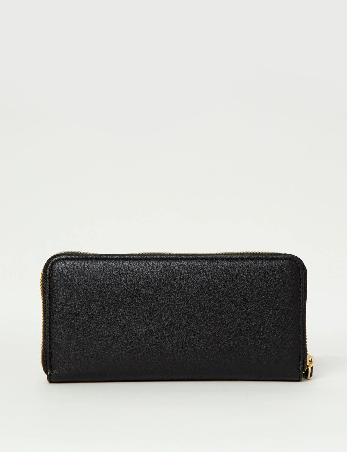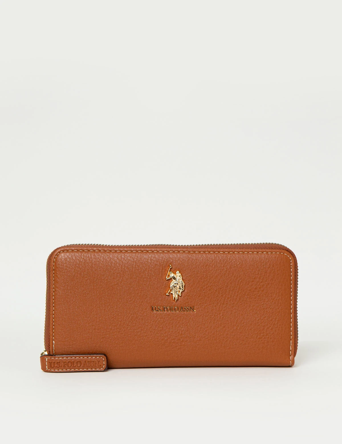 Our LARGE ZIP AROUND WALLET exudes luxury with its polished metal logo and a zip around closure, featuring a branded zipper pull for an extra touch of distinction. Inside, two compartments house eight slots for credit cards, complemented by a secure zippered pocket.