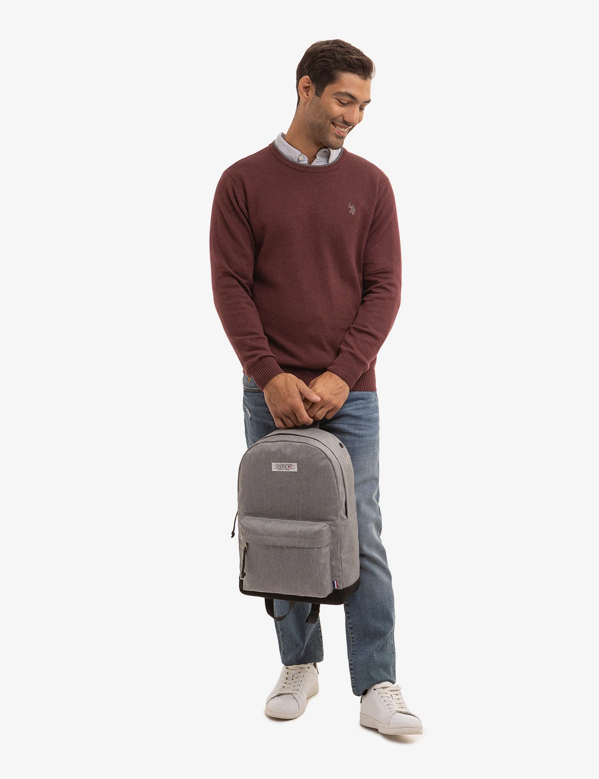 Our MENS HEATHER BACKPACK is equipped with a distinguished USPA woven patch at the top center front and an exterior front pocket with a zipper closure. Additionally, its heather grey design is complemented by adjustable padded straps and a spacious interior mesh pocket.