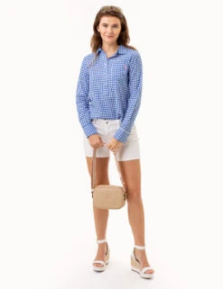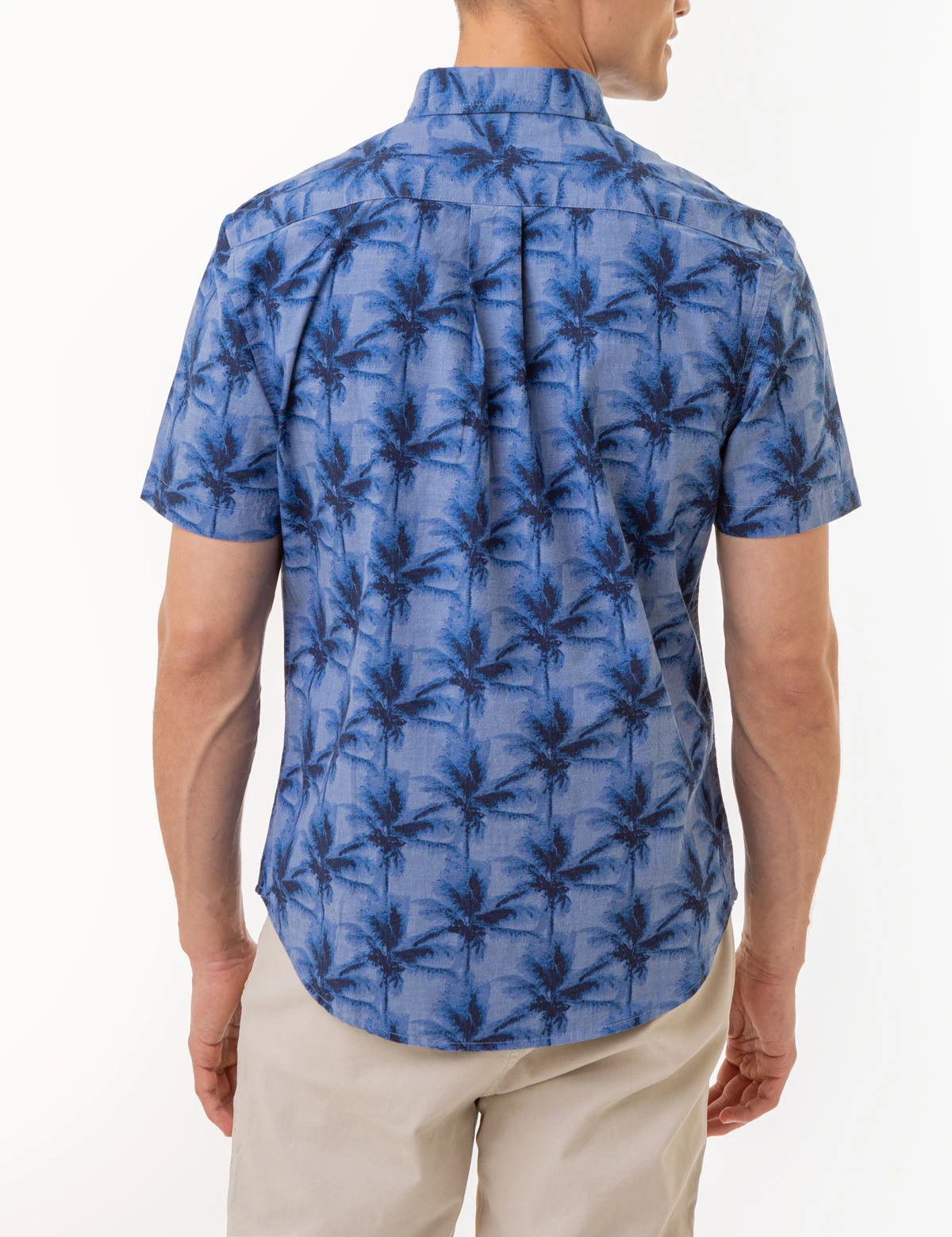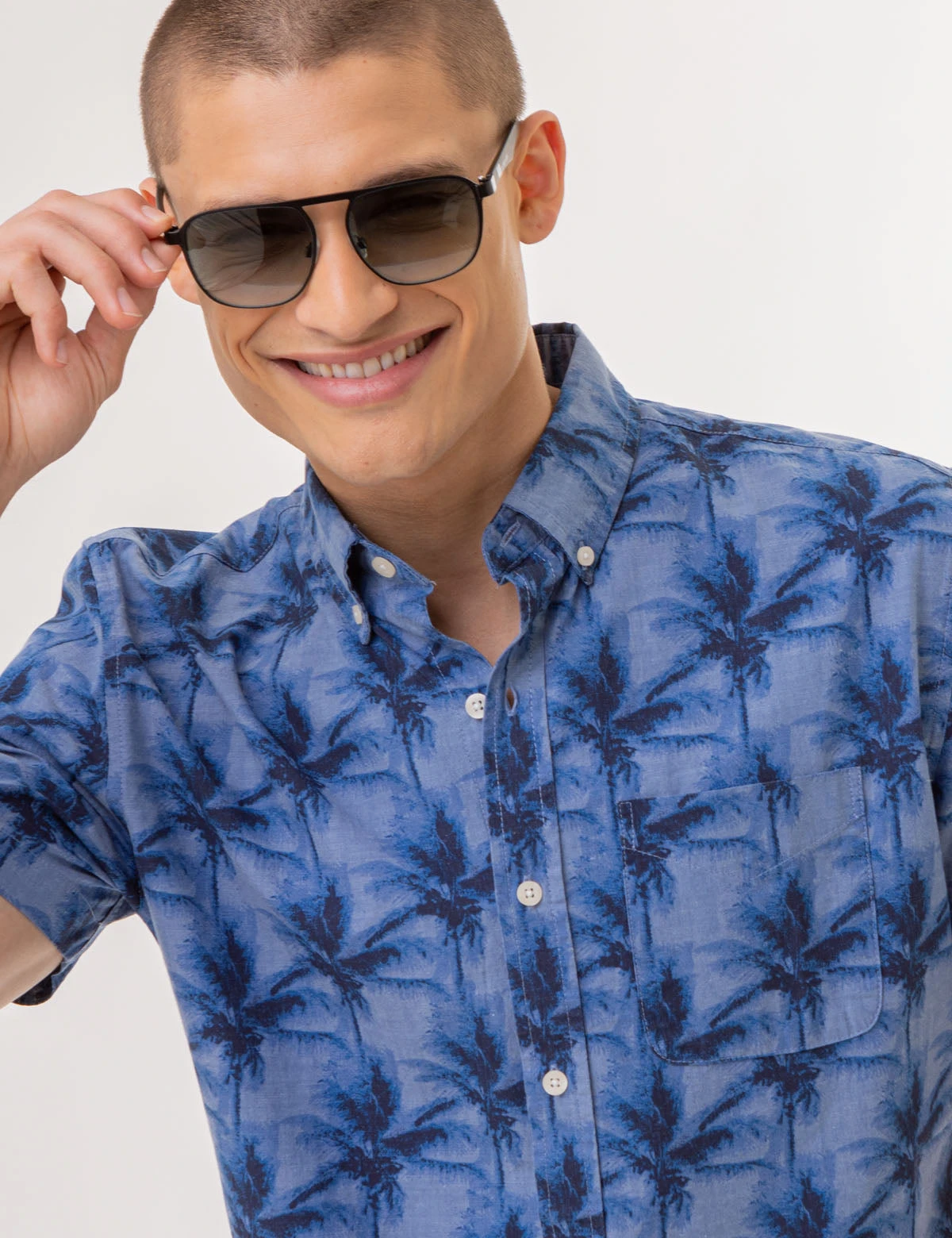 Clad the canvas of your wardrobe with our luxurious PALM TREE SLUB CHAMBRAY WOVEN SHIRT – boasting a unique allover palm tree print, chambray fabrication, a patch pocket, and a branded patch near the hemline. Model is wearing a size Medium.Â