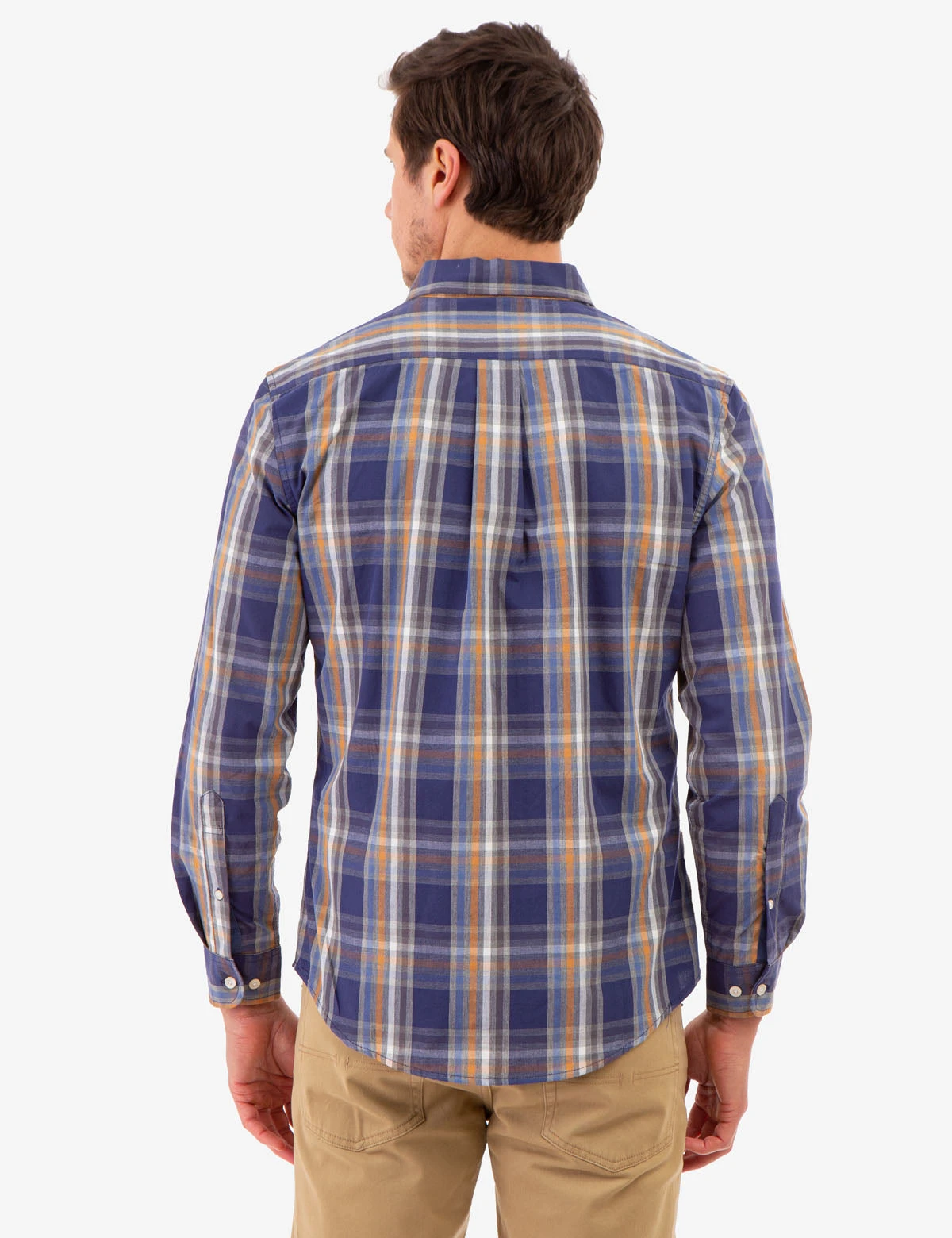 A classic checkered print adorns this PEACHED POPLIN PLAID LONG SLEEVE SHIRT, accented by a buttoned front closure and a curved hem. Featuring long sleeves with buttoned cuffs, it is complete with a patch pocket carrying a signature, contrasting logo for a touch of luxury. Model is wearing a size Medium.