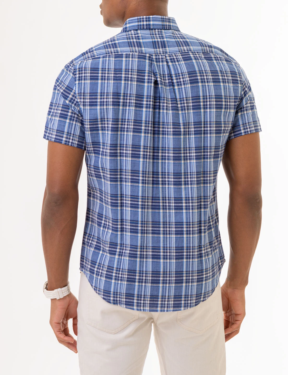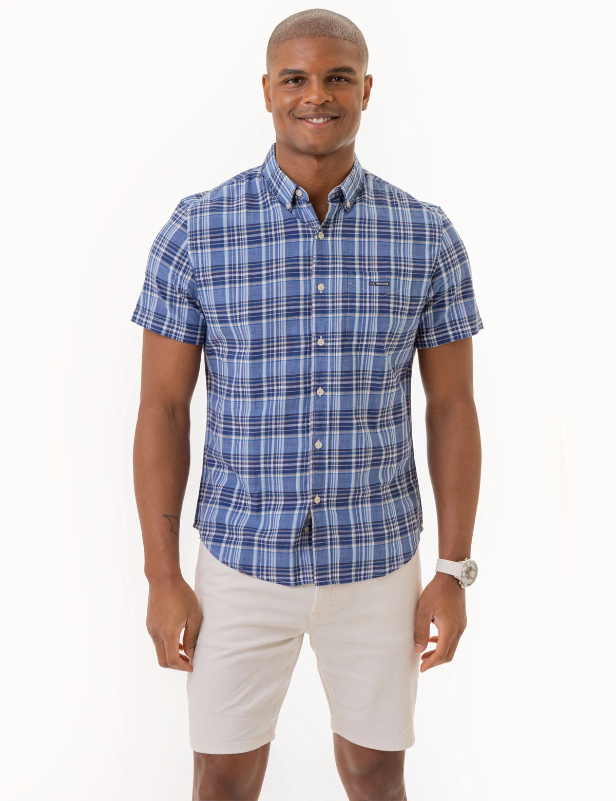 Elevate your off-duty style with our PLAID SLUB POPLIN SHORT SLEEVE SHIRT. Boasting a buttoned closure and a branded patch over the left chest patch pocket, this short-sleeved top features a curved hemline and an allover plaid print for the perfect finishing touch. Model is wearing a size Medium.Â
