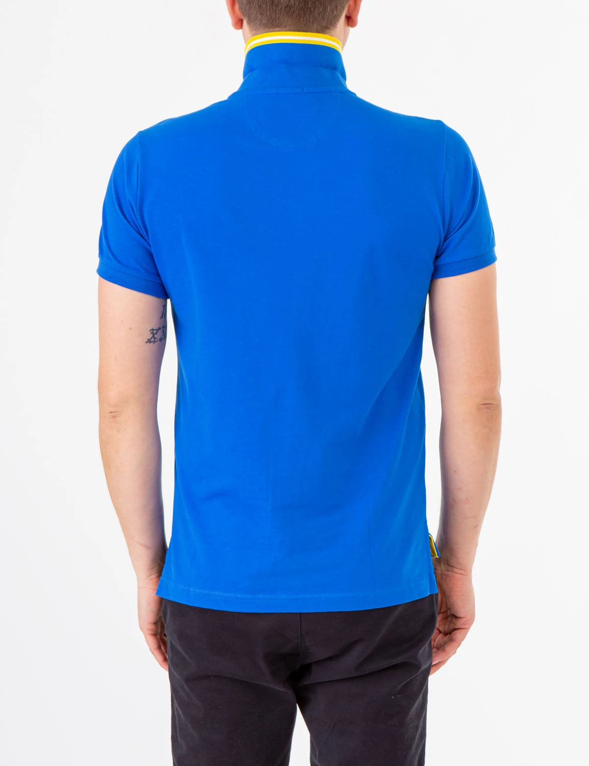 Our SLIM FIT STRETCH PIQUE POLO SHIRT boasts a tipped collared neckline with an underside detail, a contrasting two-button placket and a small embroidered logo on the upper left front. Short sleeves with rib knit cuffs and vents at the hem complete the classic, slim fit profile of this luxurious polo shirt. Model is wearing a size medium.