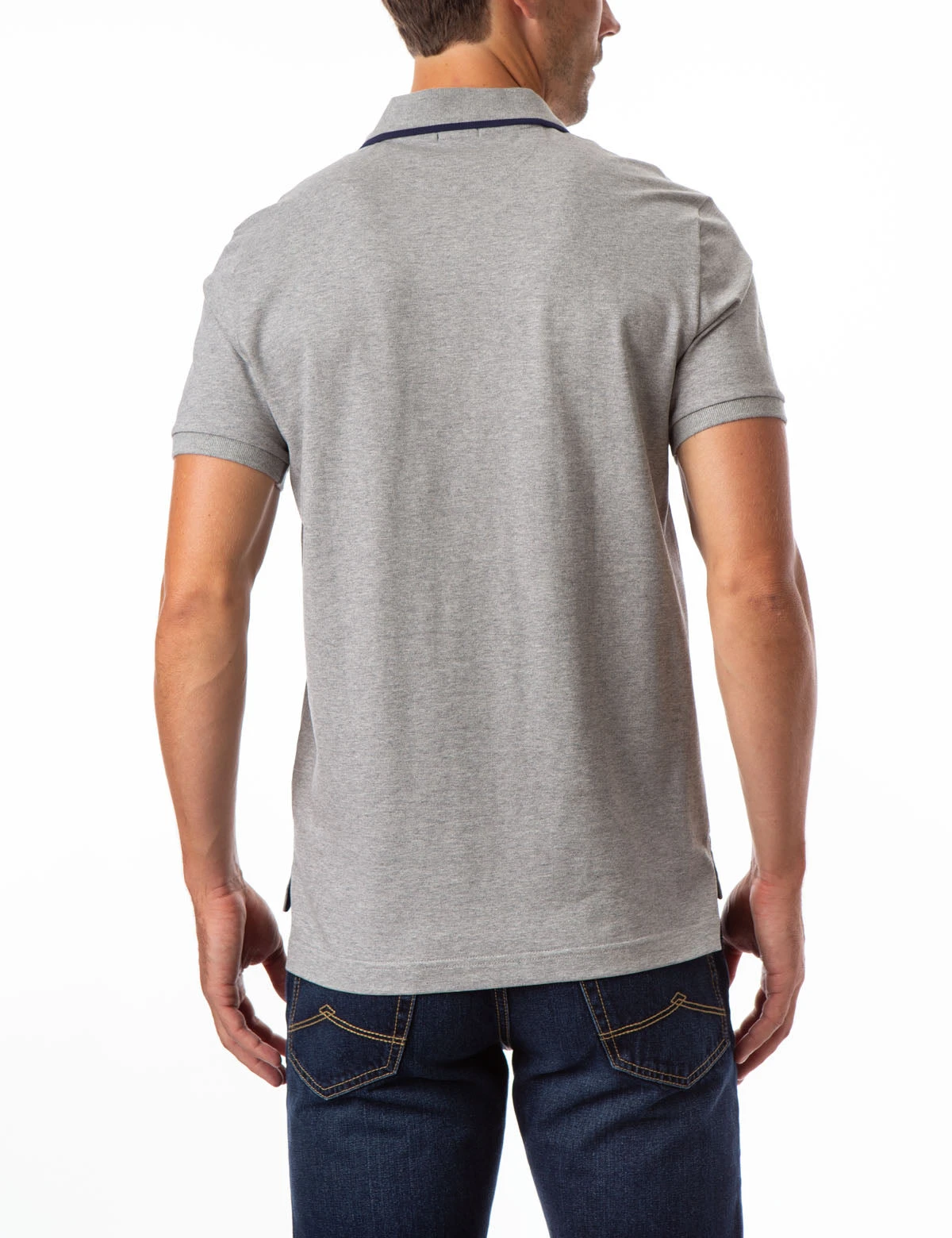 Our SLIM FIT STRETCH PIQUE POLO SHIRT boasts a tipped collared neckline with an underside detail, a contrasting two-button placket and a small embroidered logo on the upper left front. Short sleeves with rib knit cuffs and vents at the hem complete the classic, slim fit profile of this luxurious polo shirt. Model is wearing a size medium.
