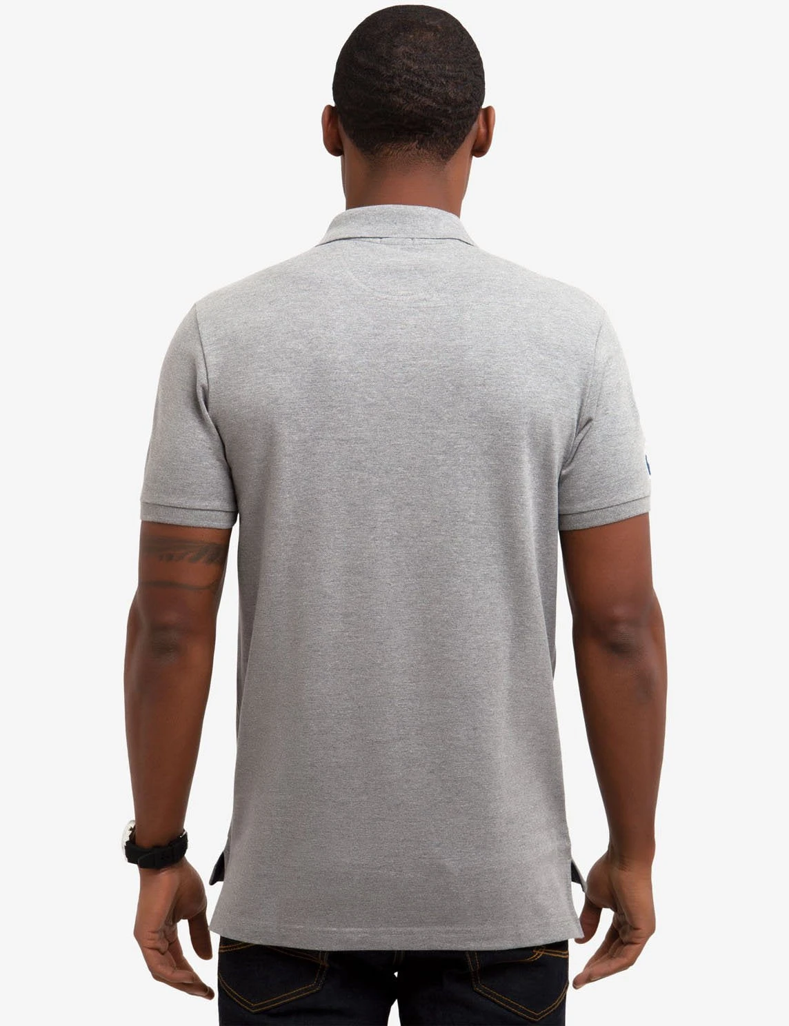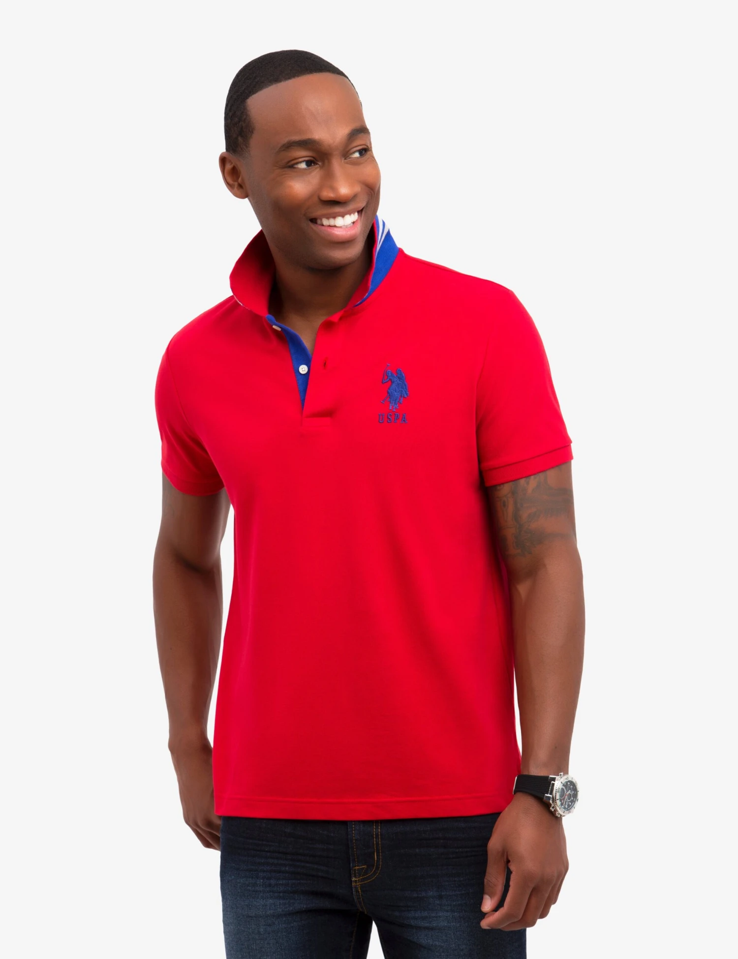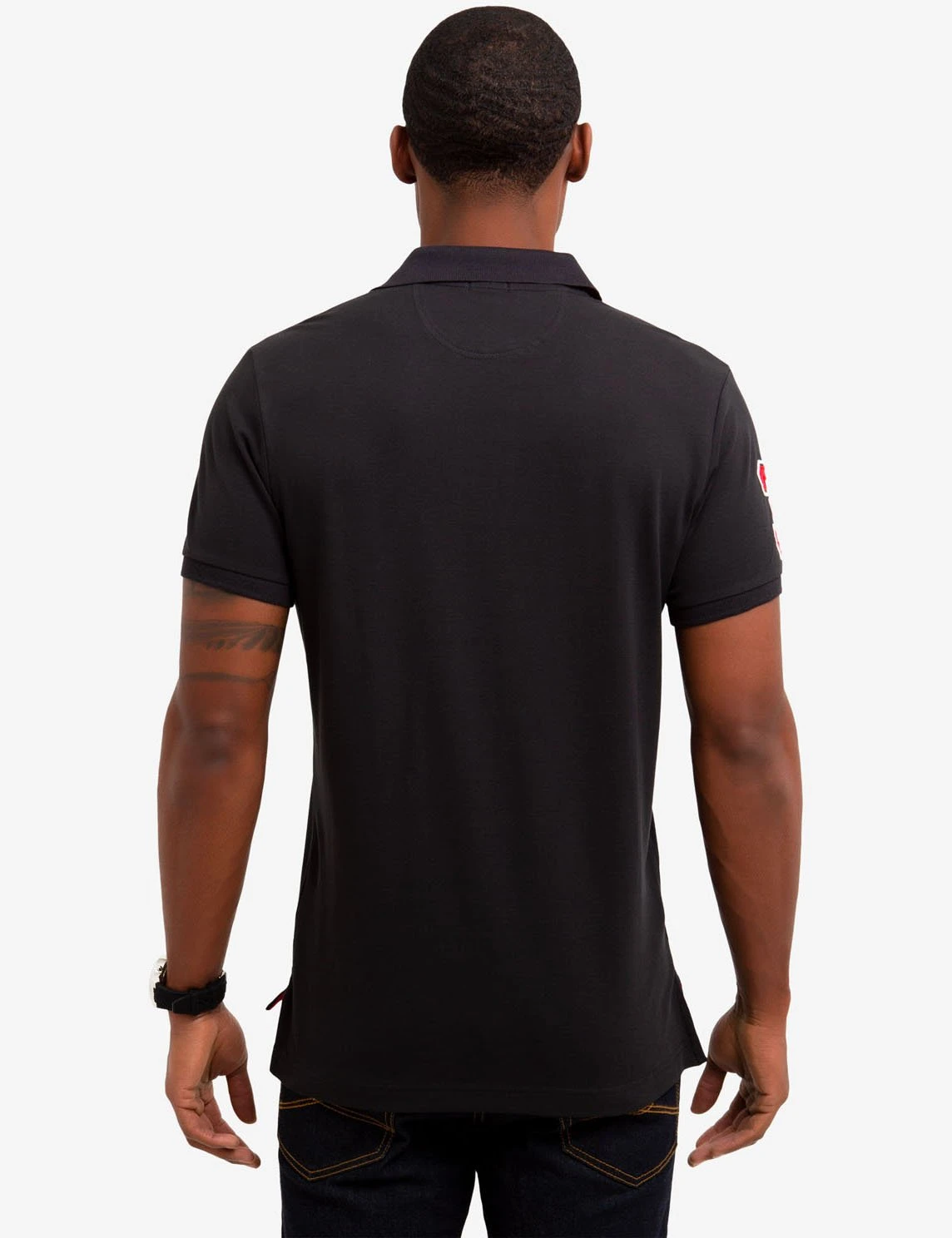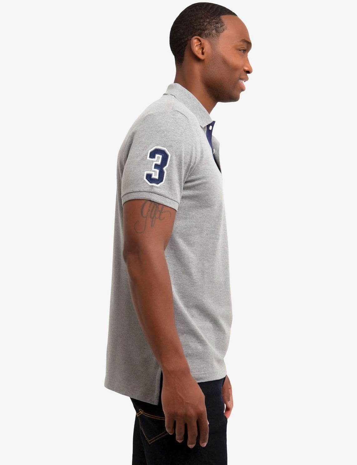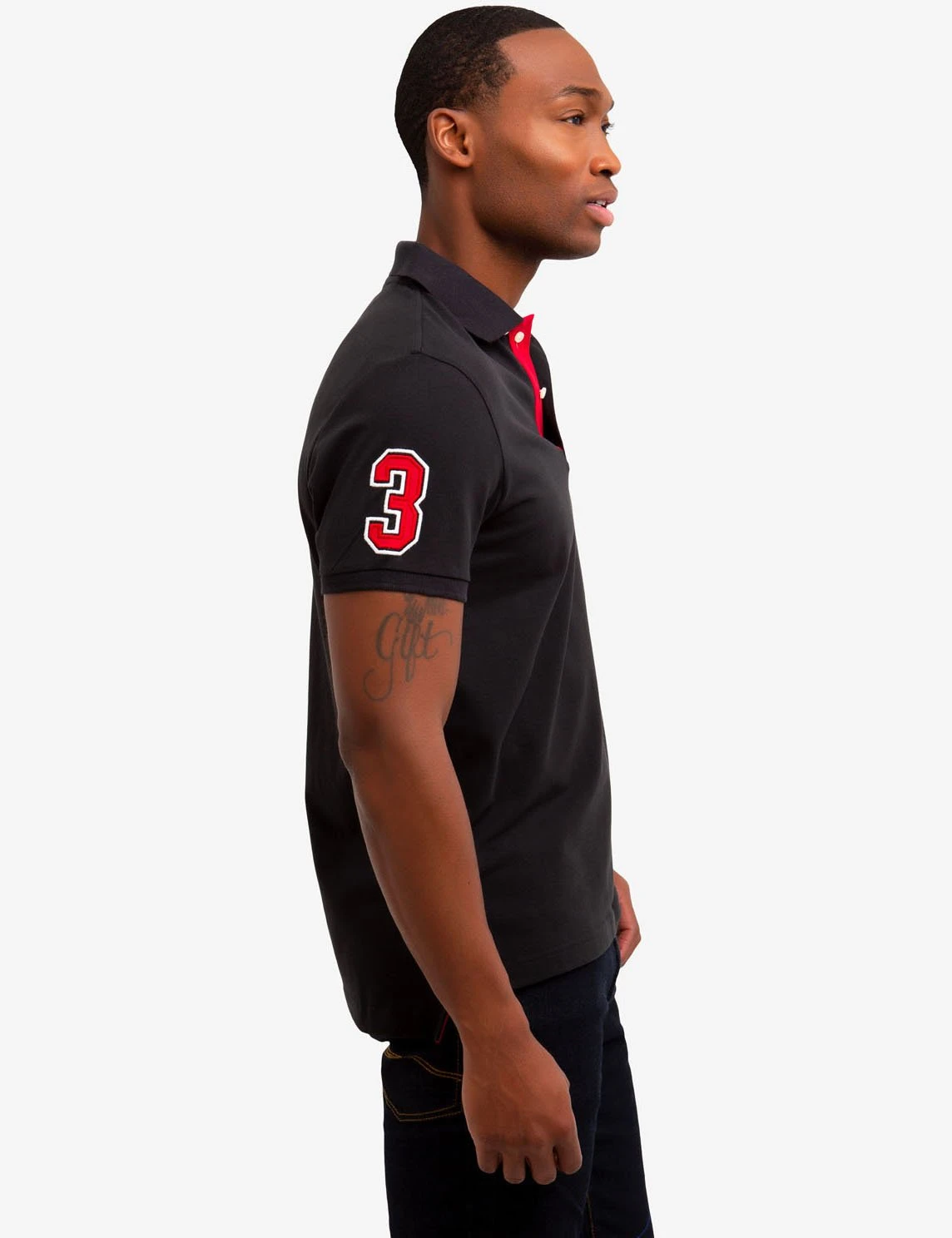 Featuring a striped jacquard detail at the collar, luxurious large embroidery on the upper left front, and a number 3 patch on the right sleeve bedecked with finesse embroidery, our SLIM FIT STRETCH POLO SHIRT is a must-have core style. This style also includes vented hems with contrast taping and a back that is longer than the front. Model is wearing size medium.