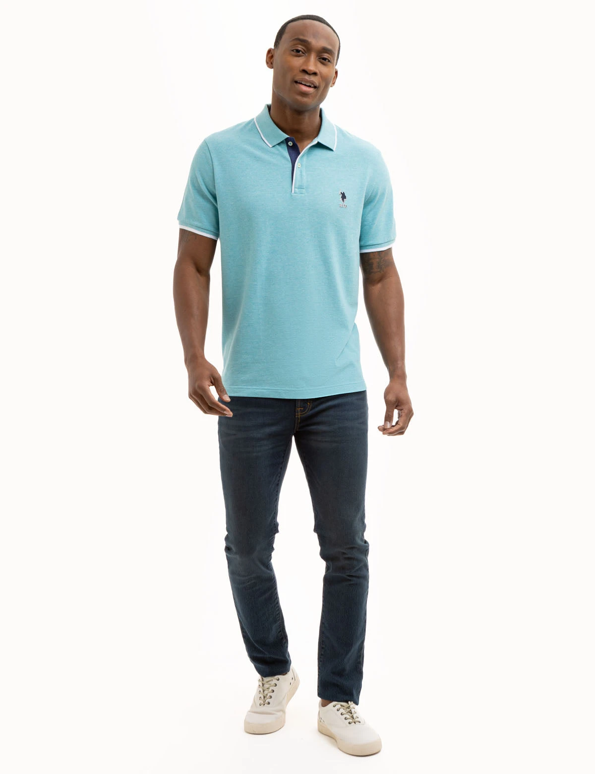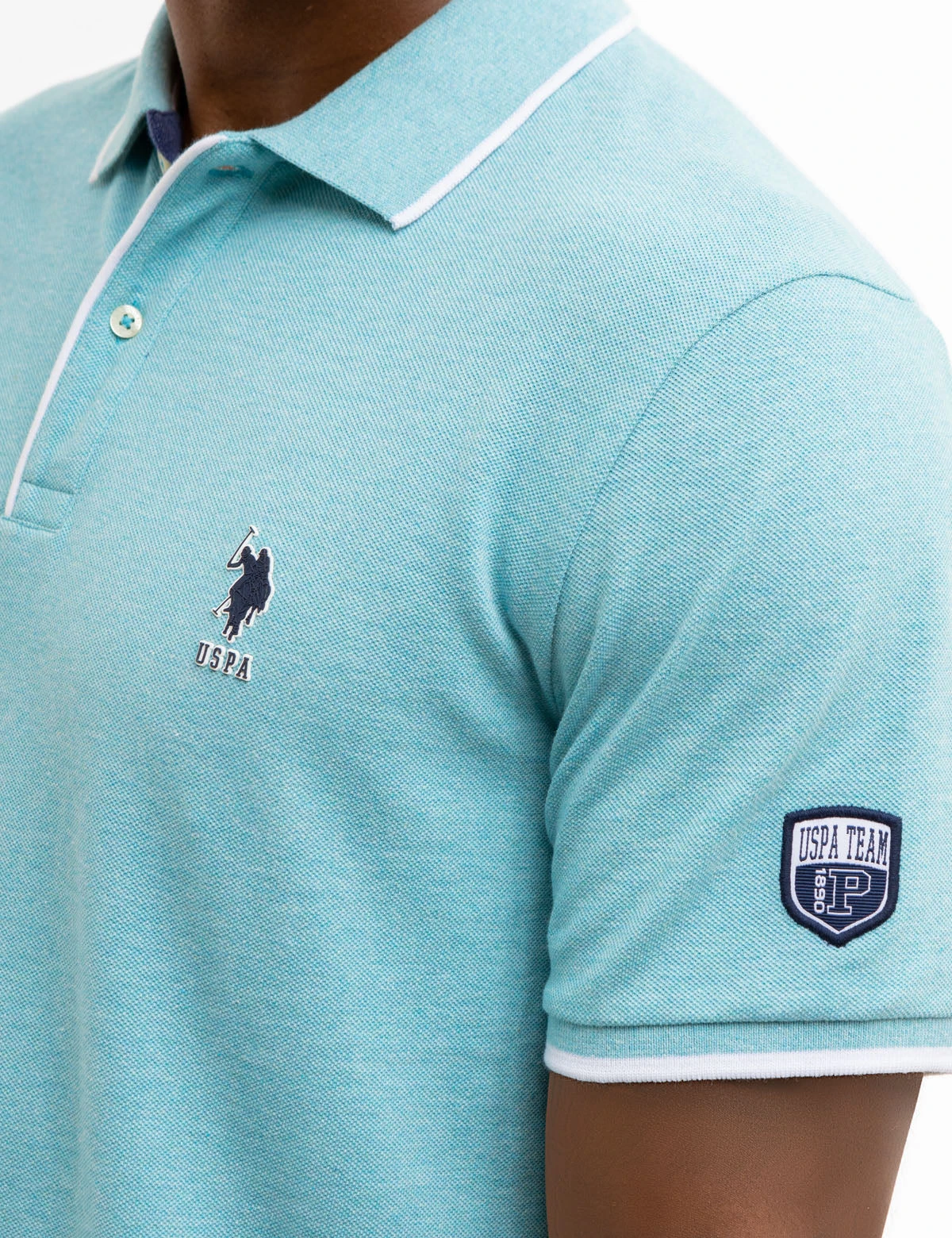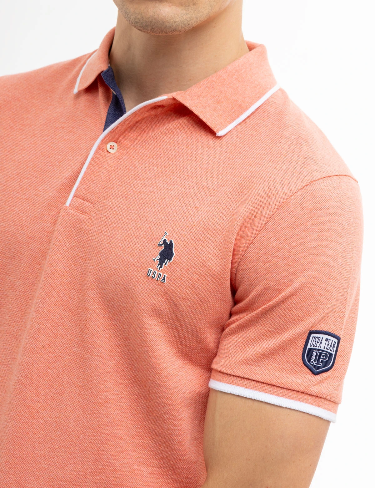 Our USPA TEAM PIPED HEATHER PIQUE POLO SHIRT is an essential addition to any wardrobe. The collar boasts a subtle tipped design with a striking two-button placket, while the short, ribbed cuffs feature tipped details. A small rubber USPA logo is featured on the upper front left, and a USPA Team patch adorns the left sleeve. Trimmed with vents at the hem, this style exudes undeniable sophistication. Model is wearing a size medium.