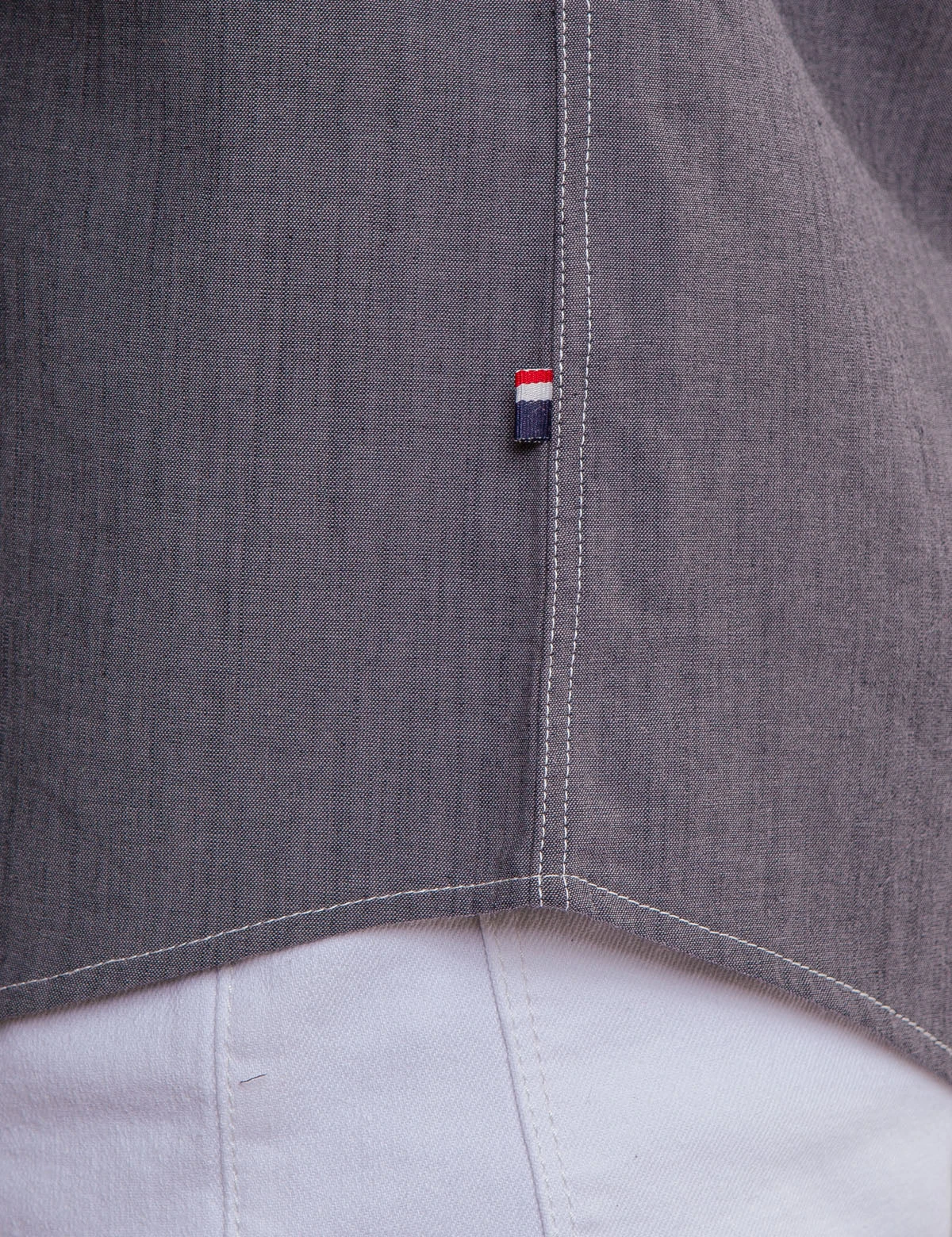 - Signature stripe detail on left side hem.
