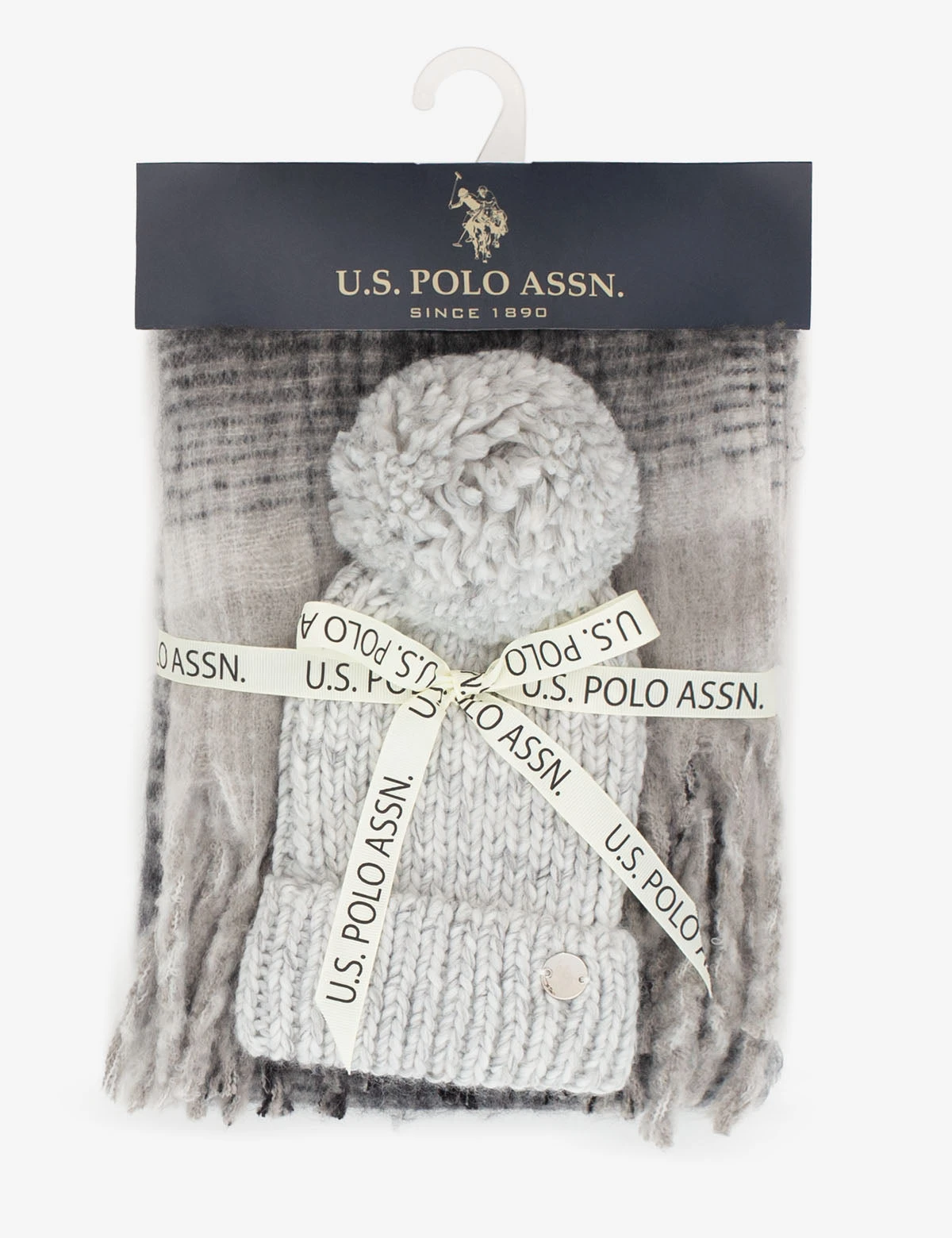 U.S. Polo Assn. WOMENS POM POM BEANIE AND PLAID SCARF SET