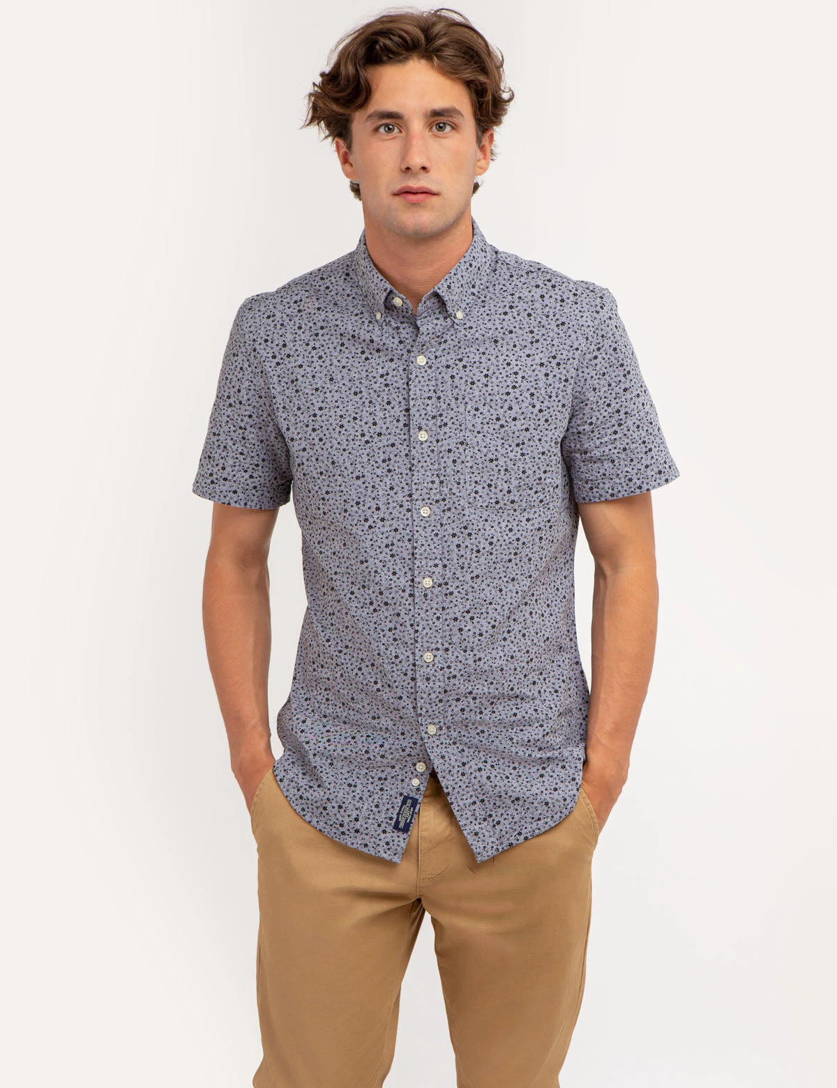 Encompassing a classic silhouette, the YARN DYE DISCHARGED PRINT SHORT SLEEVE SHIRT is the epitome of effortless elegance. Featuring a spread collar adorned with button detailing, the shirt also boasts a buttoned front closure and short sleeves. Rounding out the design is an allover contrasting floral print that renders it a truly unique, yet timeless addition to one’s wardrobe. Model is wearing a size Medium.